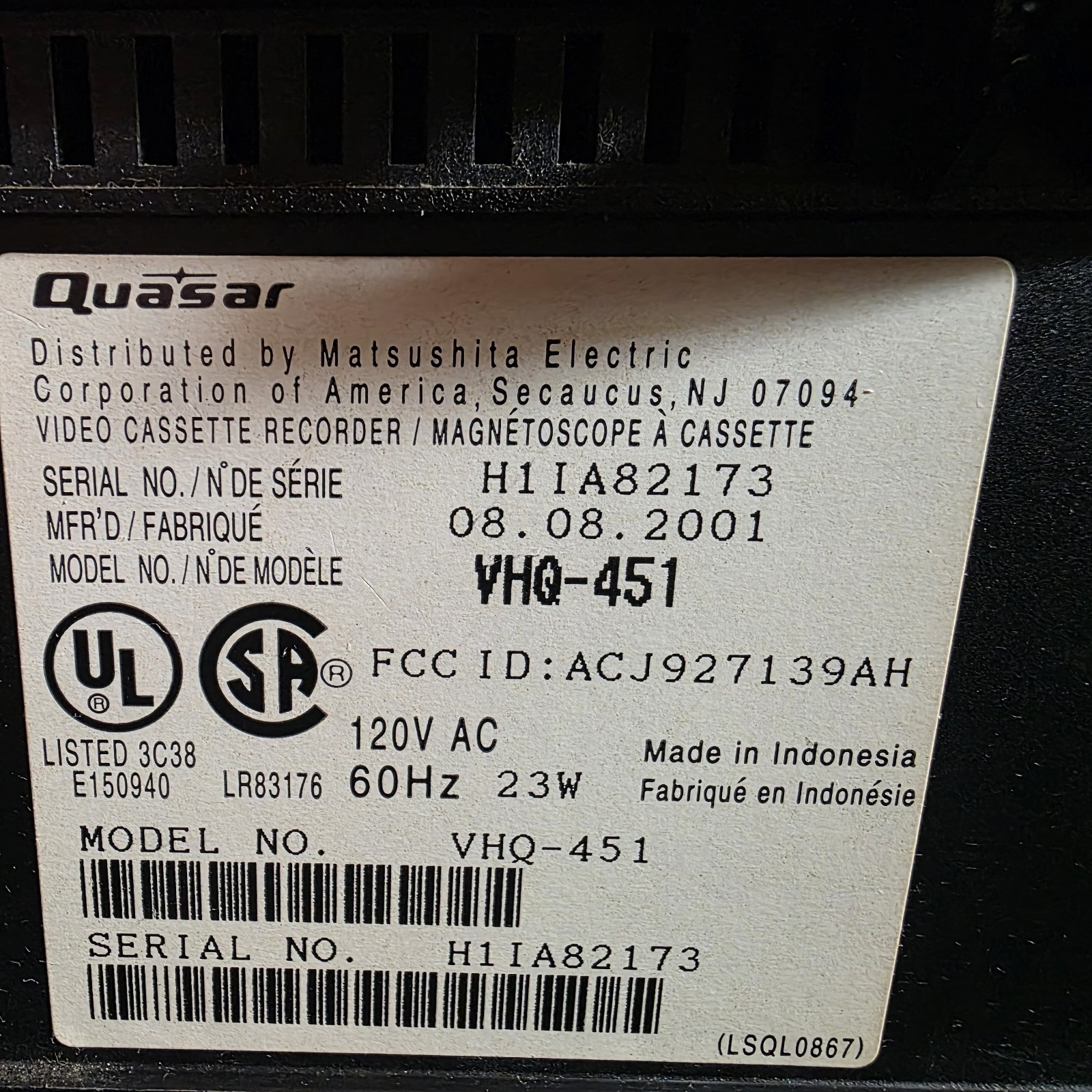 Quasar Omnivision VHQ-451 VCR 4 Head VHS Video Cassette Player Working No Remote
