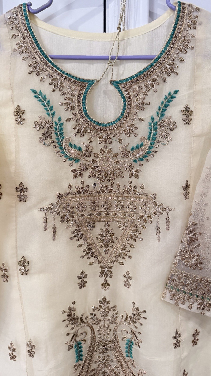 как выглядит Embroidered Beige Kurta for Women with Green and Gold Detailing фото