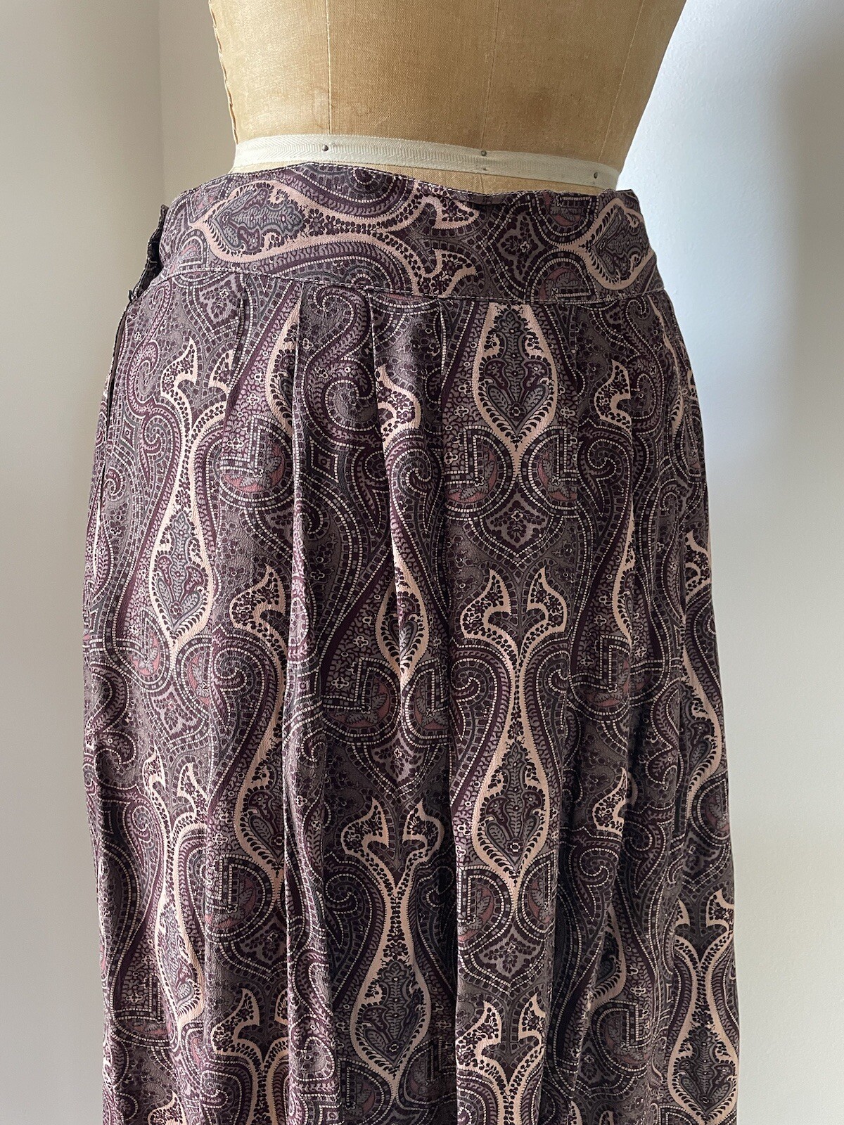 Vintage 80s 90s Paisley Print Midi Skirt Pleated Rayon Skirt Muted Plum S/M