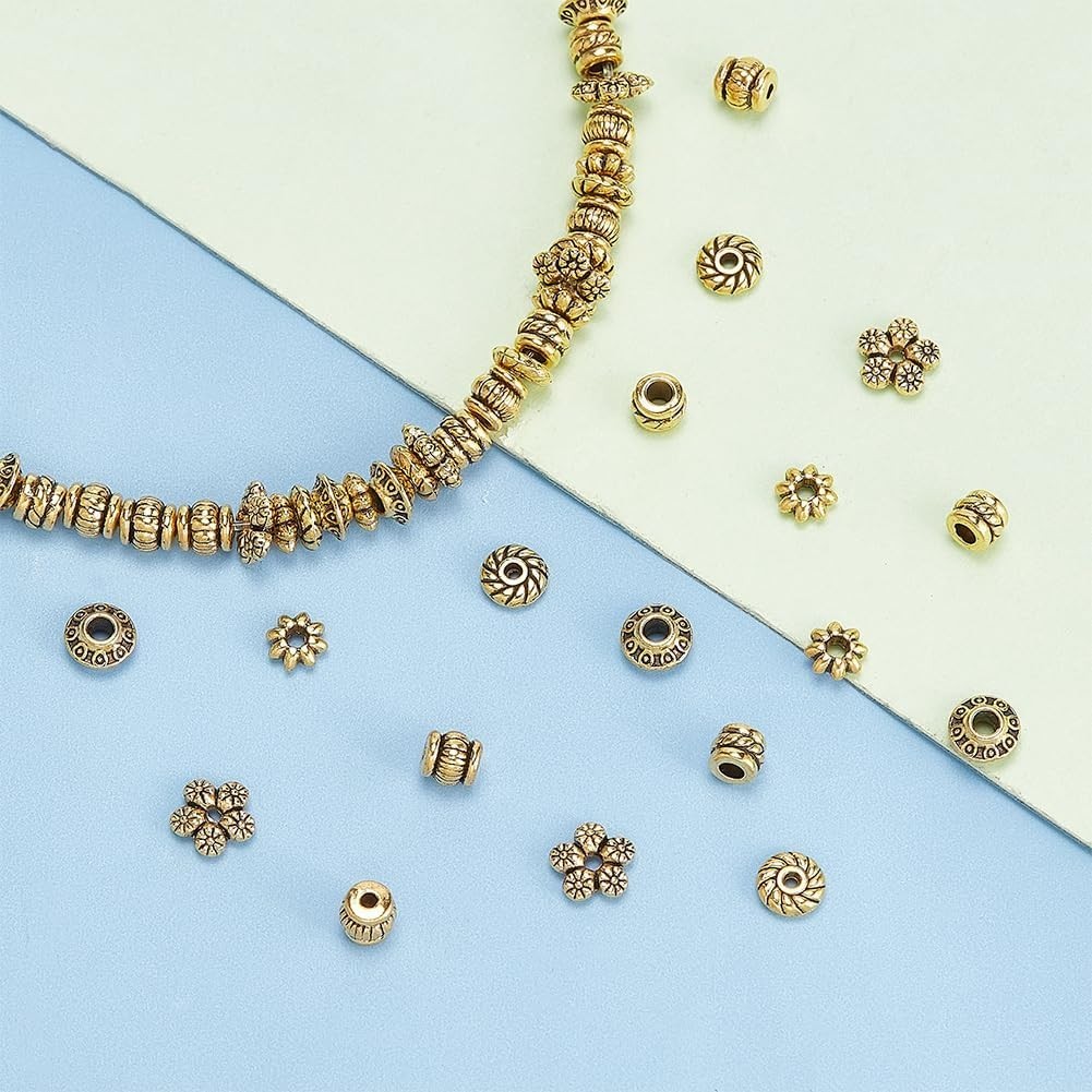 300pcs Tibetan Spacer Beads, 6 Style Antique Golden Spacers Alloy Metal Tube ...