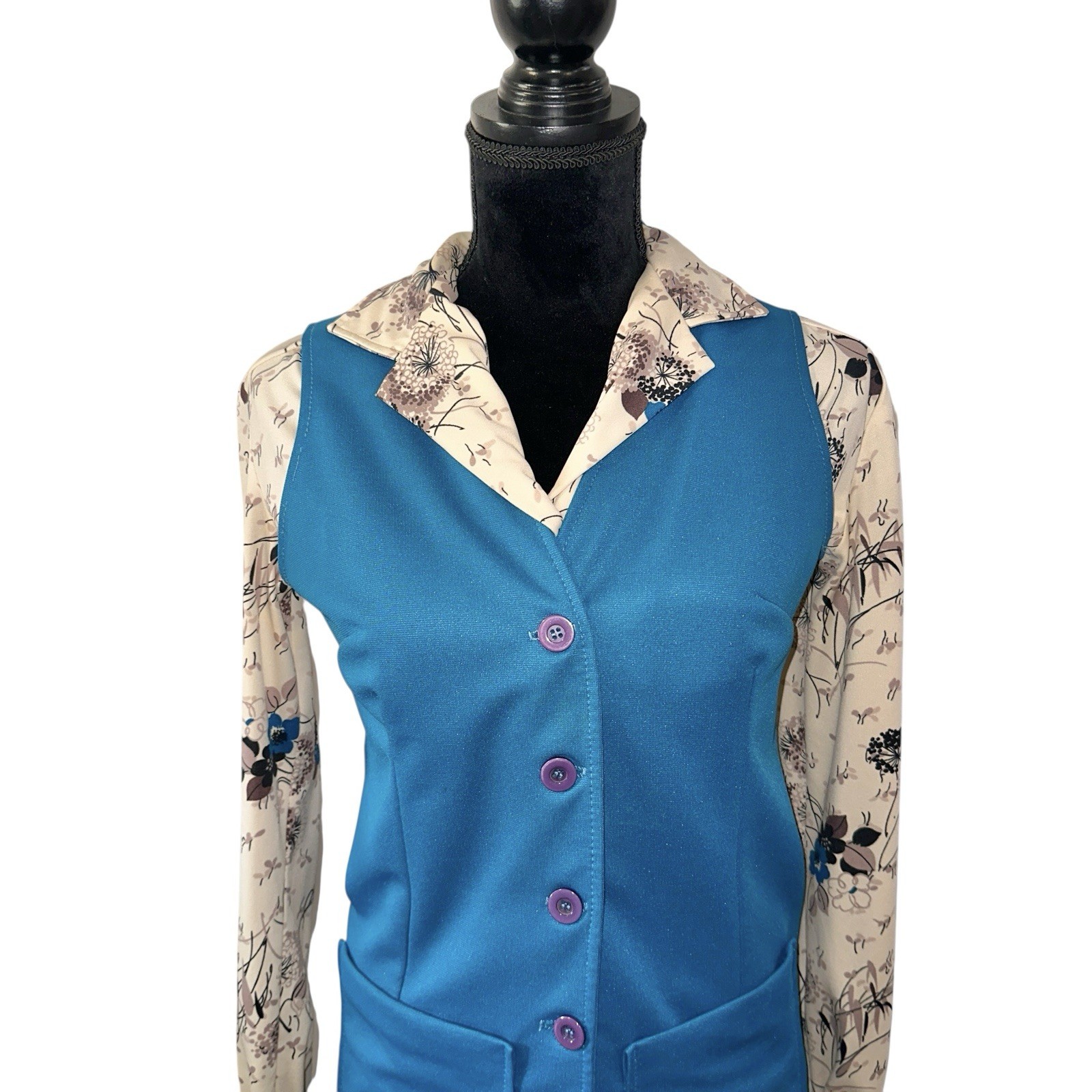 Vtg 3 Piece Women s 70s Vest And Skirt Set With Blouse Size 12 Teal Blue
