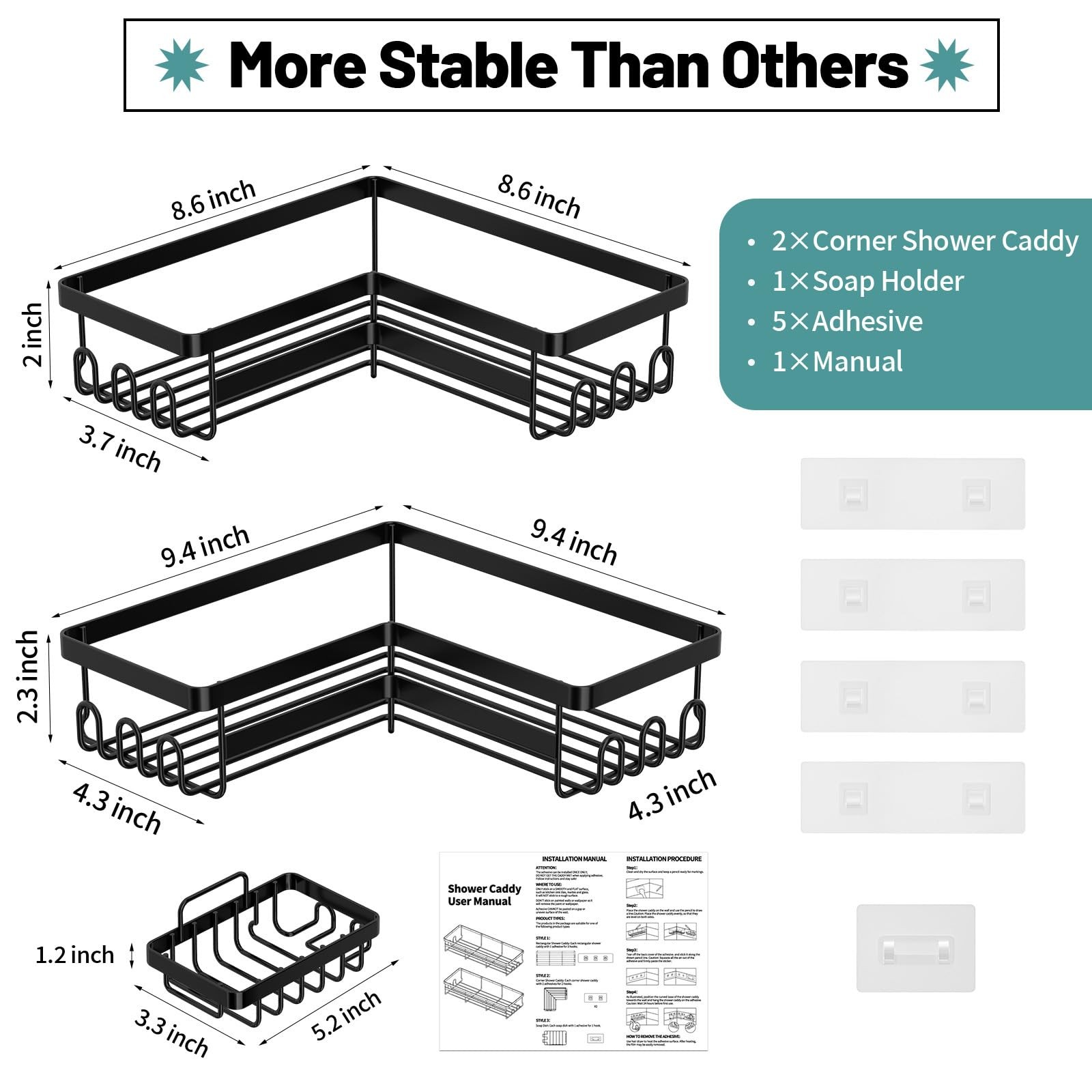 Corner Shower Caddy, 3 Pack Adhesive Bathroom with Soap Holder, Storage Stain...