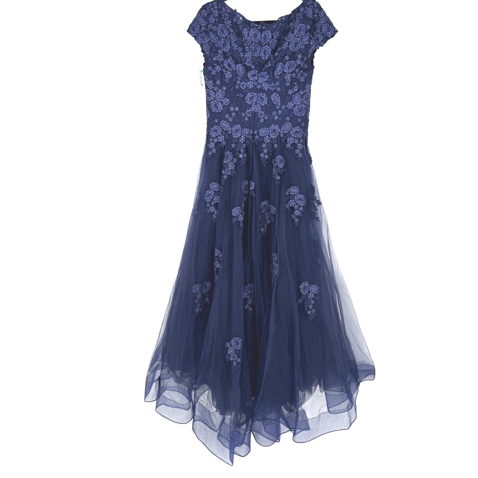 как выглядит La Femme Navy Blue Floral Lace Beaded Tulle Formal Gown Dress 12 фото