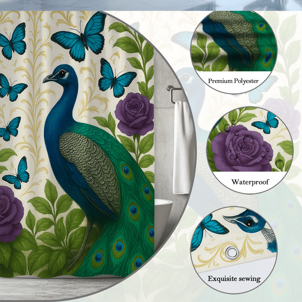 Colorful Peacock Shower Curtain with Butterflies and Floral Design