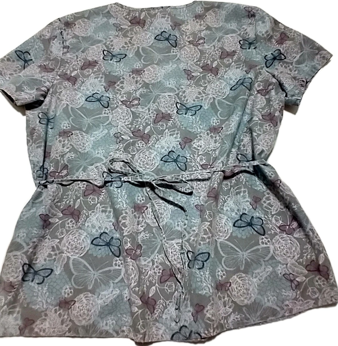 Scrub Top Size XL, by MOVIE STAR, 2 Front Pockets, Back Ties, Gray w/Butterflies