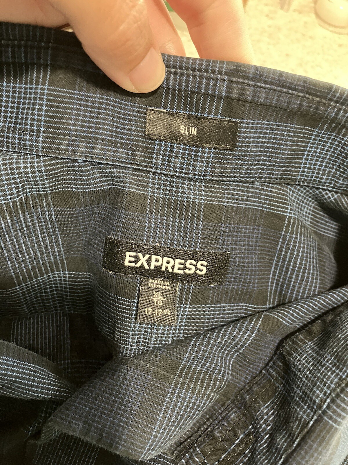 EXPRESS Men s XL Button Up Plaid Slim Fit 17-17 1/2 Blue Work Professional S6