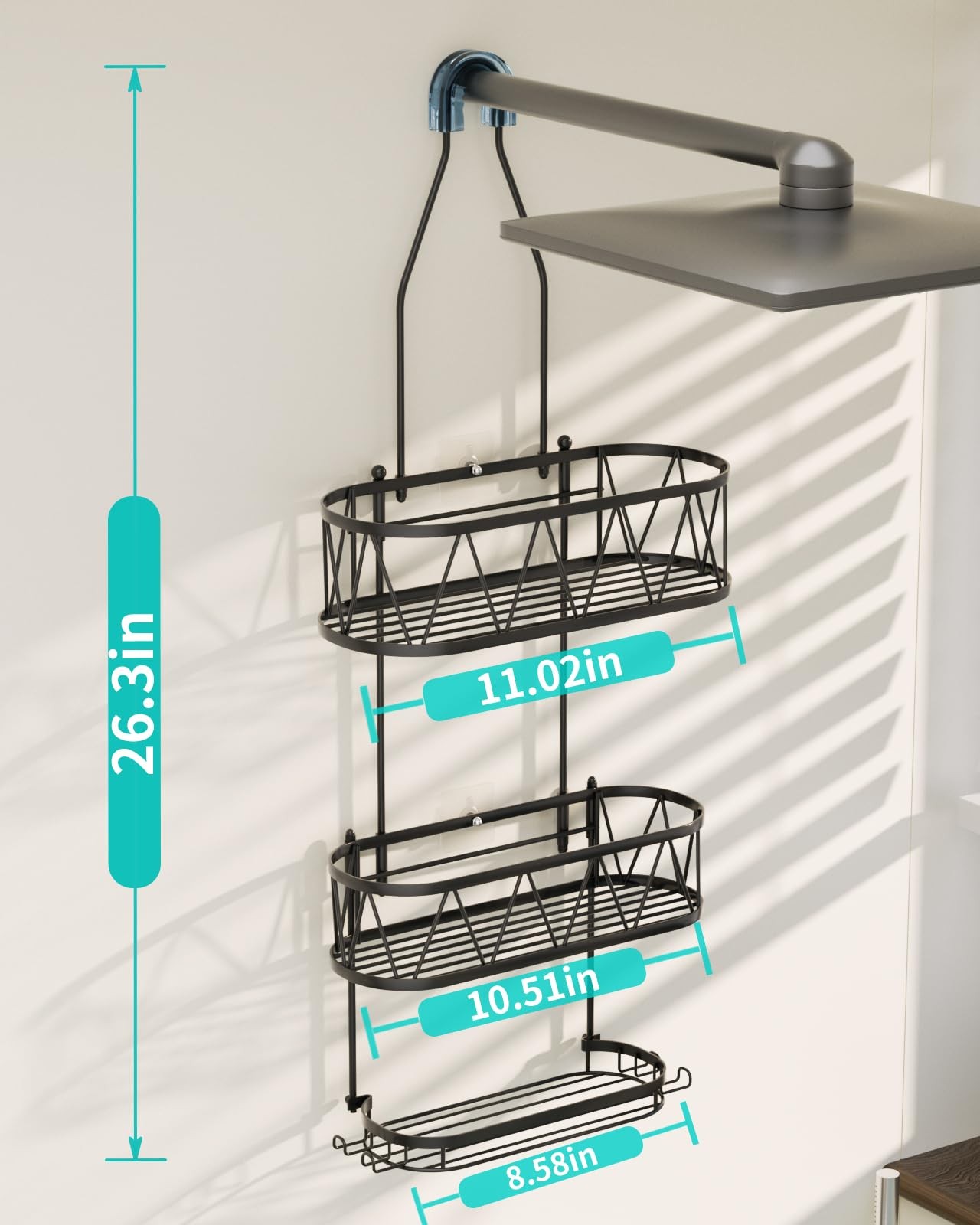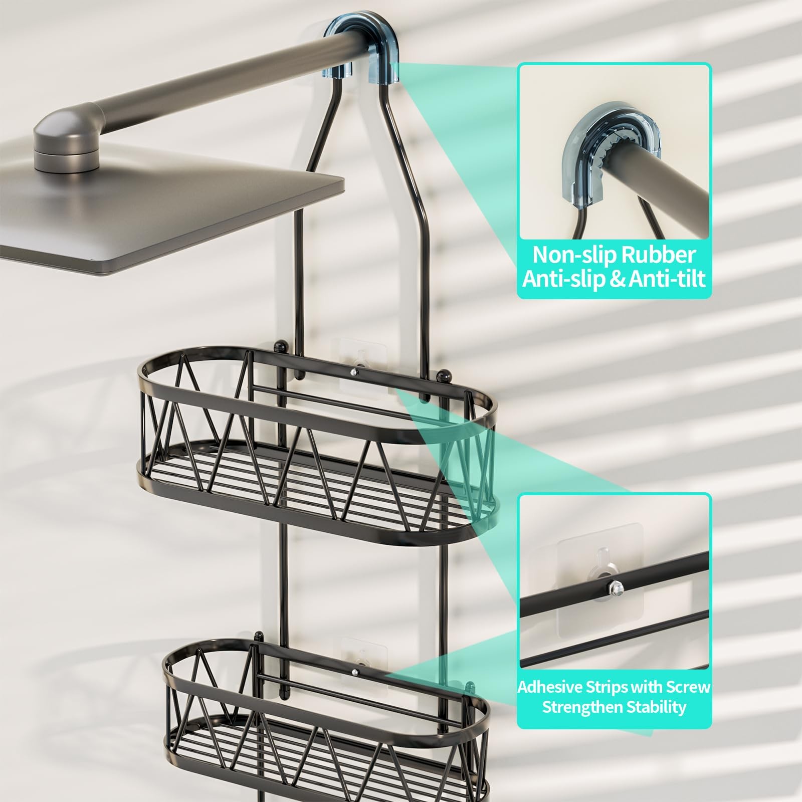 Included Components: 1*Hanging Shower Shelf, 4*Adhesives (With Screw)