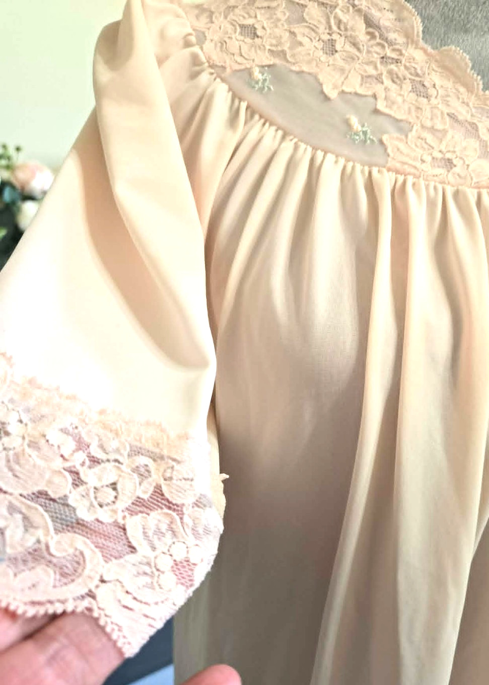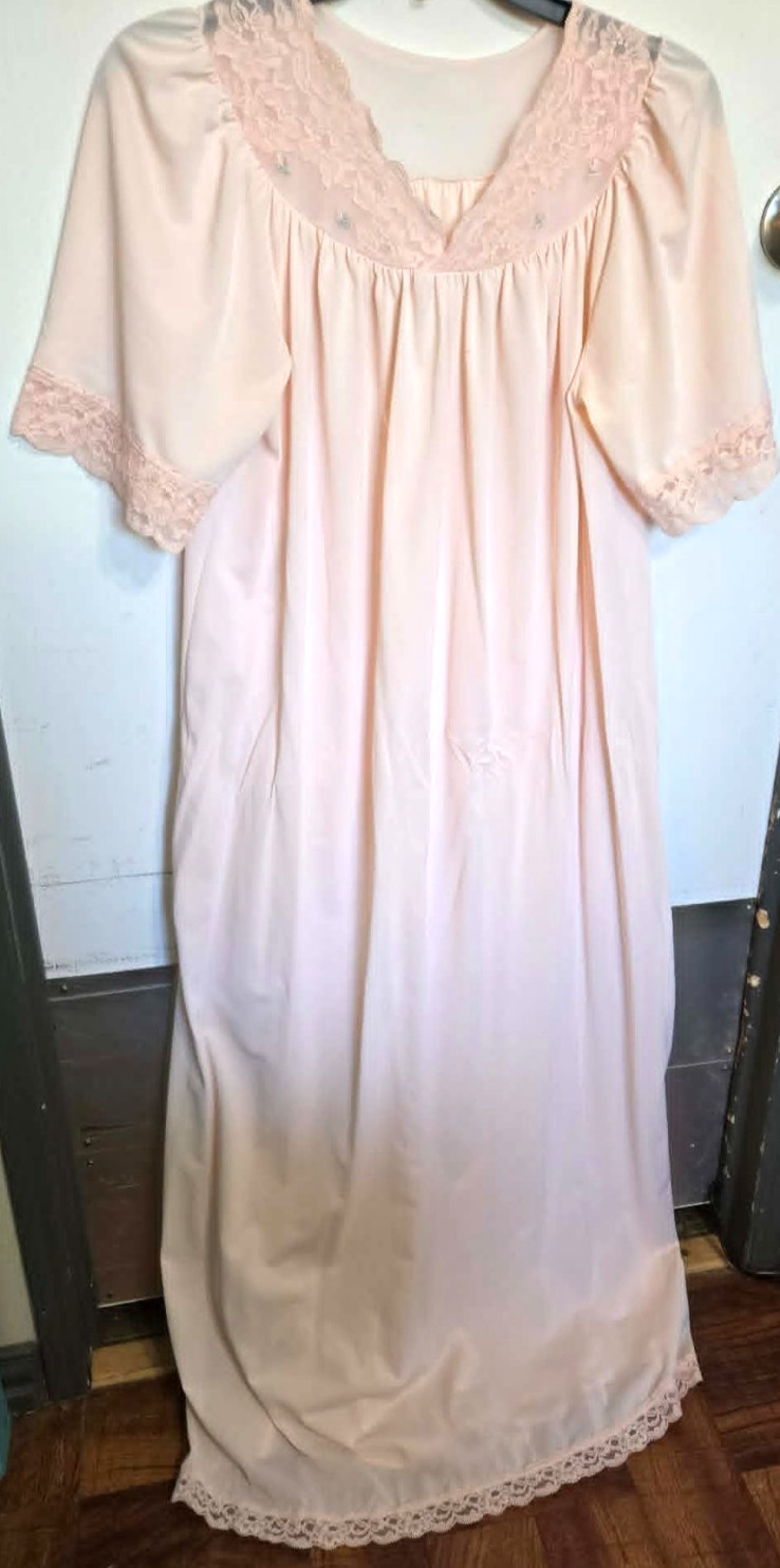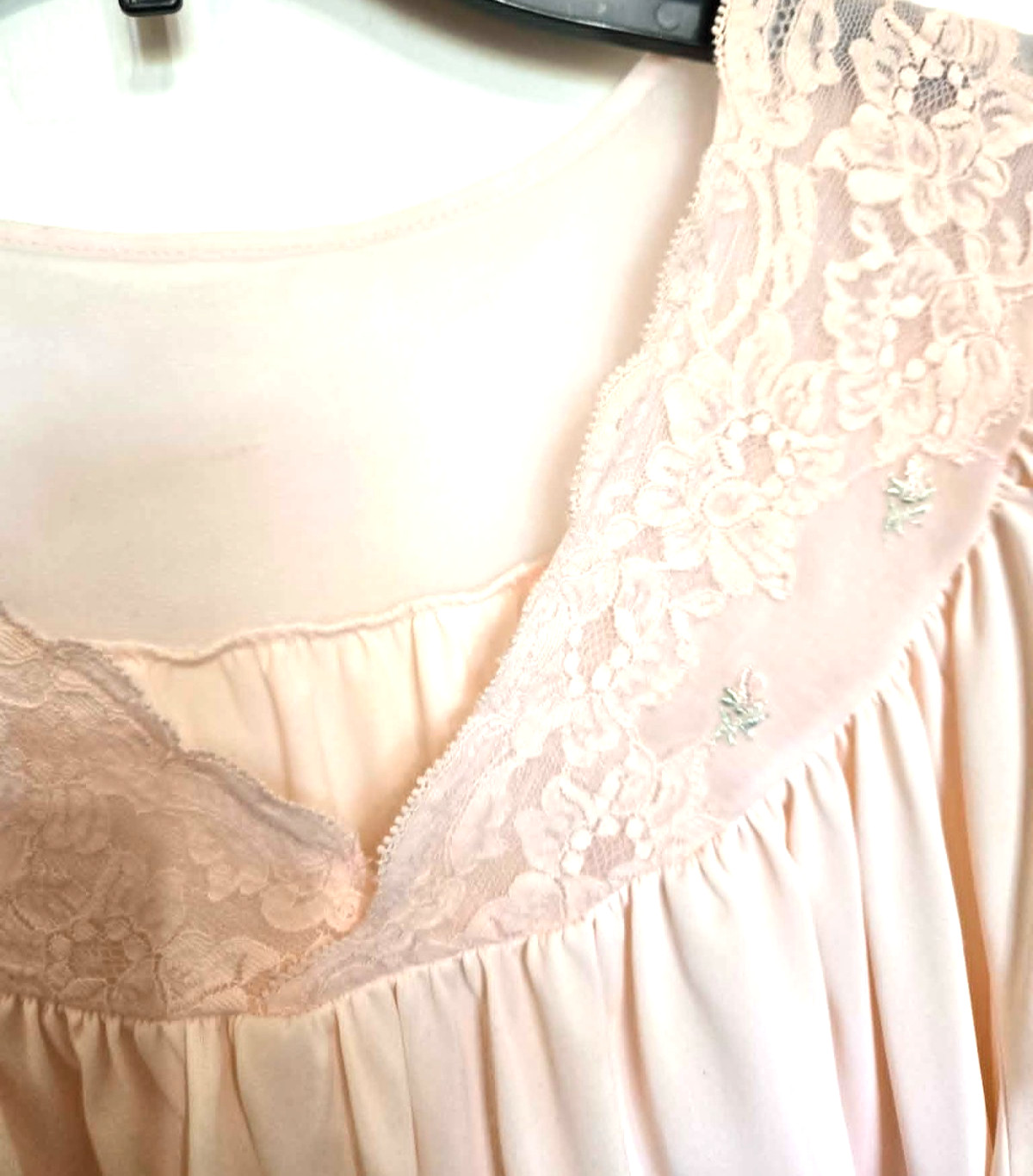 как выглядит Vintage Shadowline Long Night Gown Baby Pink Nylon Lace Cottagecore Small C600 фото