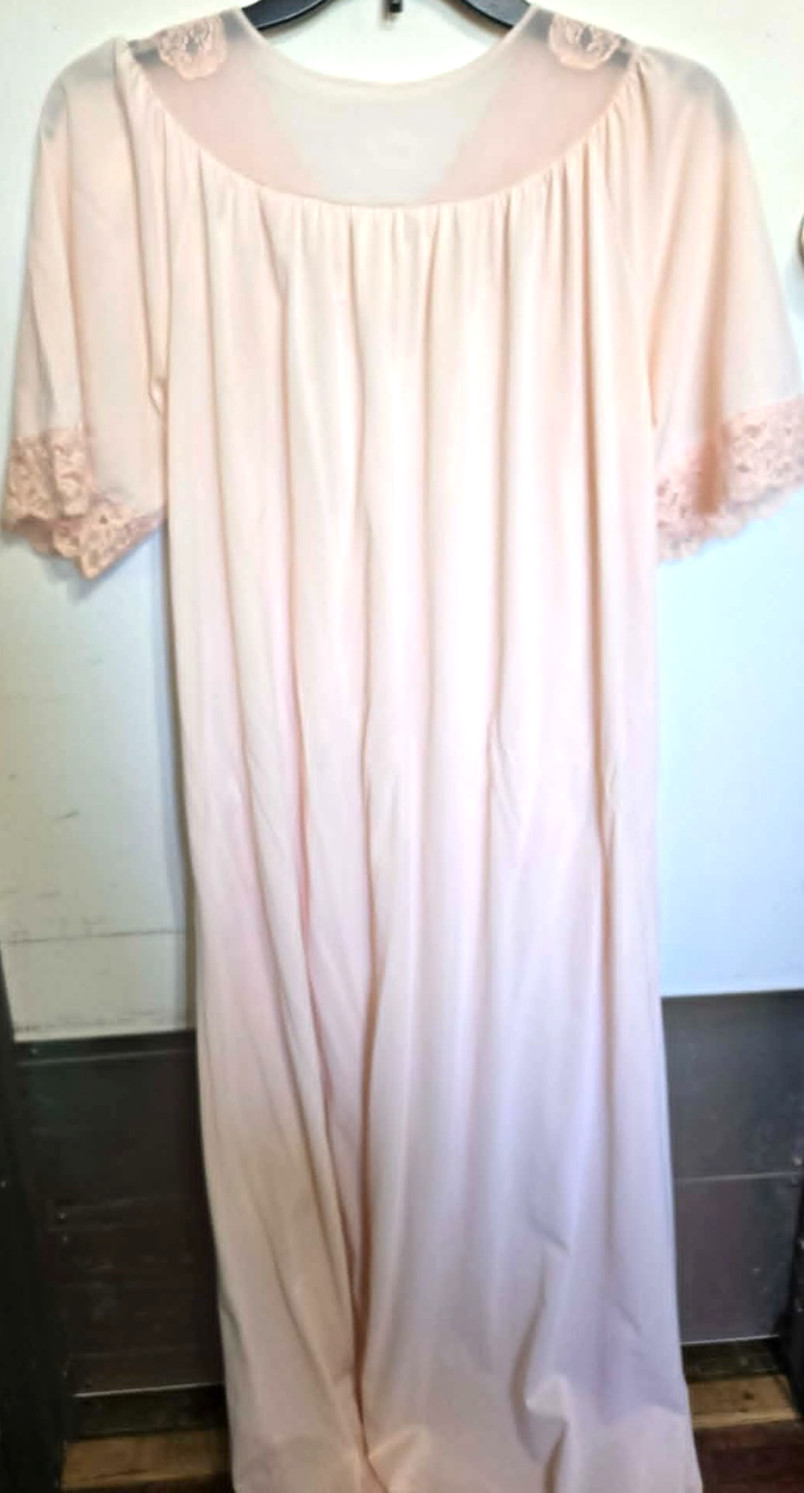 Vintage Shadowline Long Night Gown Baby Pink Nylon Lace Cottagecore Small C600