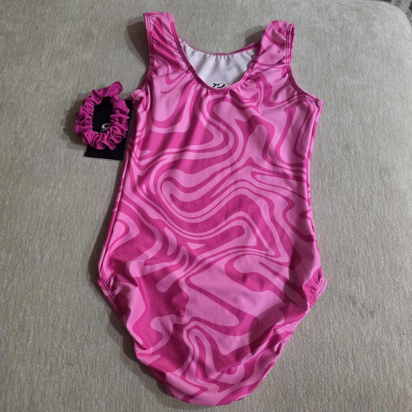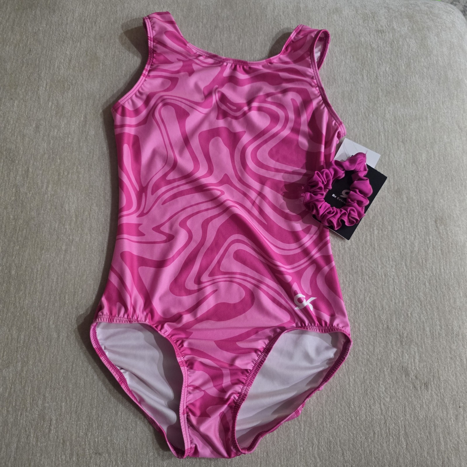 GK Elite Gymnastics Pink Marble Leotard With Scrunchie Size AXS Brand New