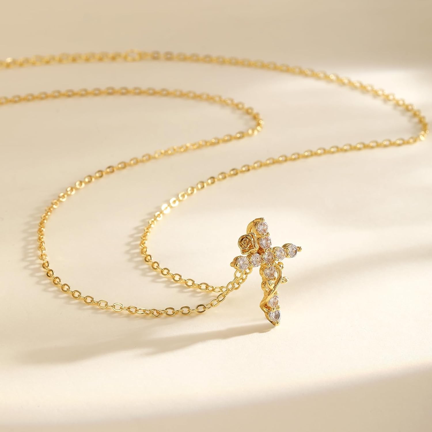 Gold Cross Necklace for Women Dainty Fashion 14K Gold Plated Zircon Rose Flower