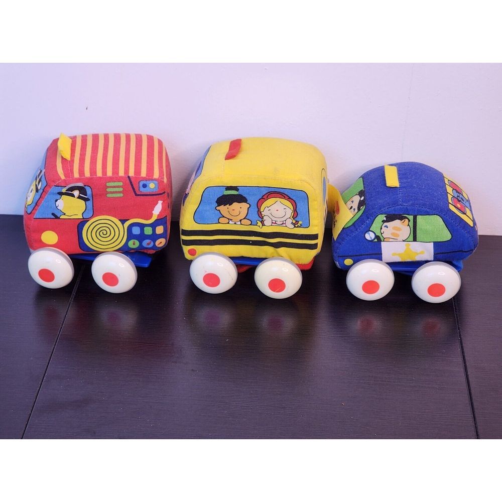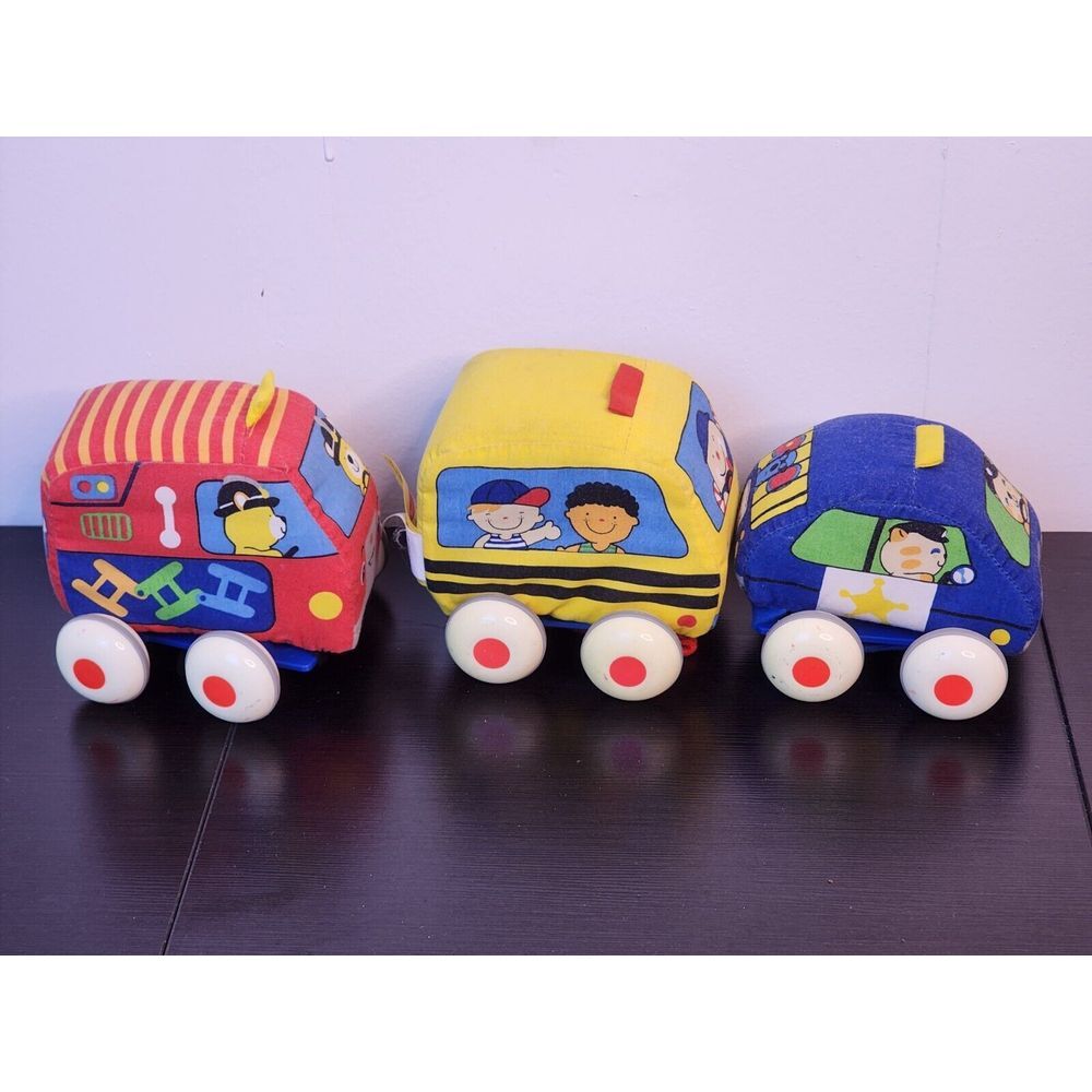 как выглядит Melissa Doug Ks Kid Pullback Vehicle Soft Cloth Plush Fire Police Bus Lot of 3 фото