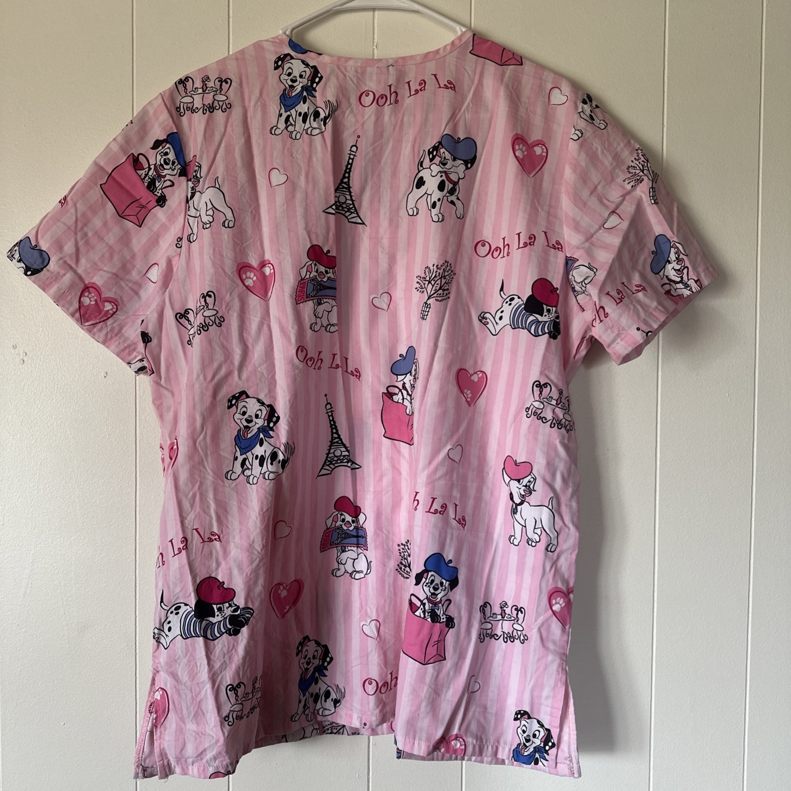 Disney Women Scrub Top M Pink Striped Graphic 101 Dalmatians DaDogs Hearts