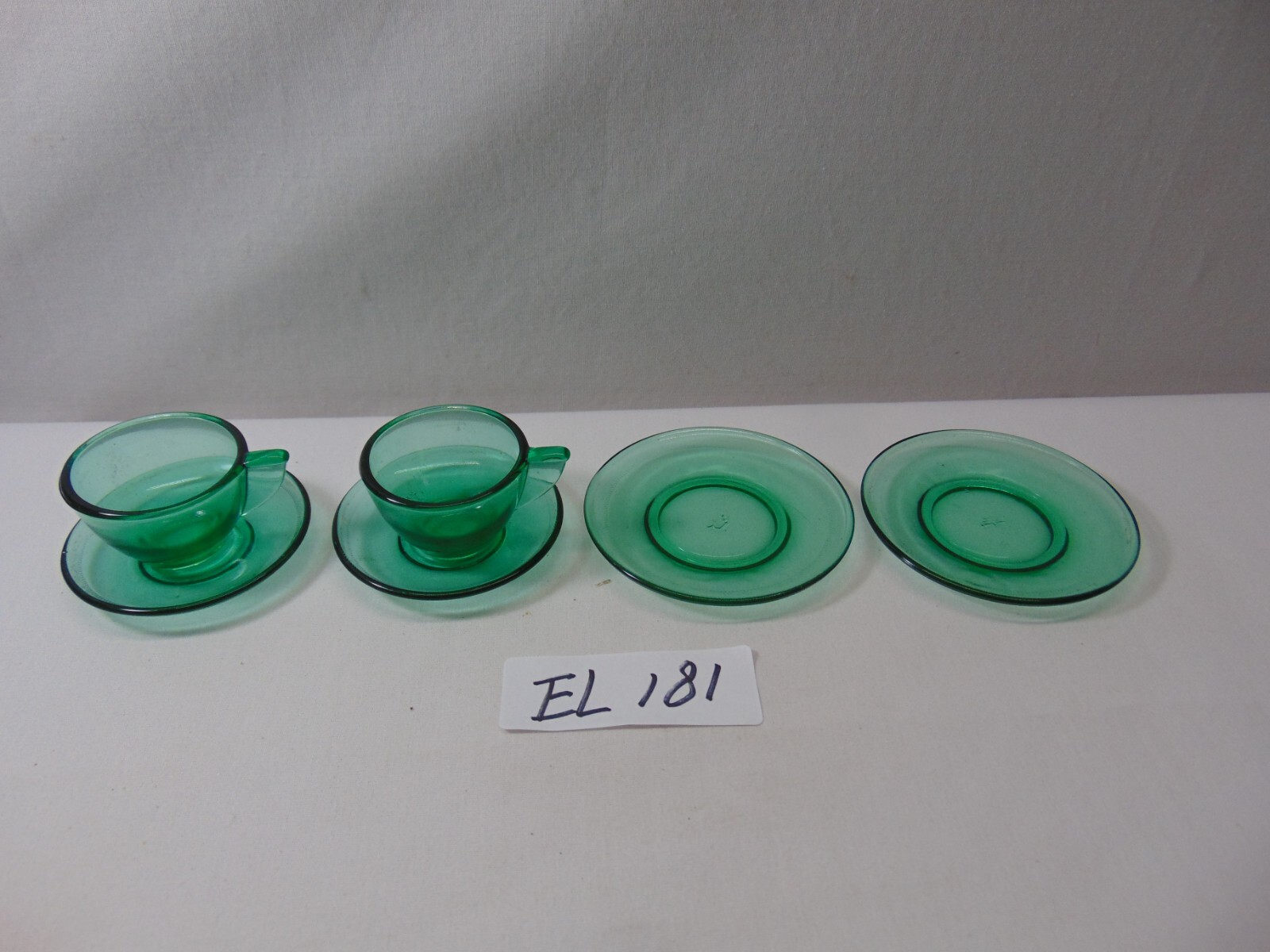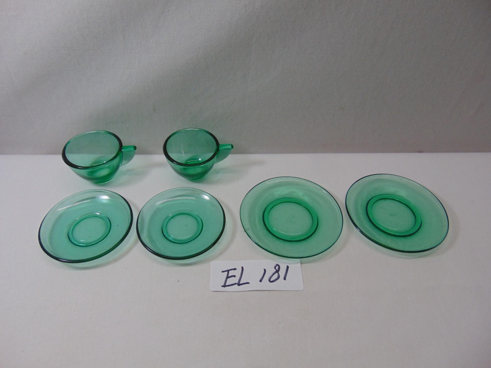Vintage Akro Green Uranium Glass Childs Play Kids 6 Pc Lot Cups Saucers Plates