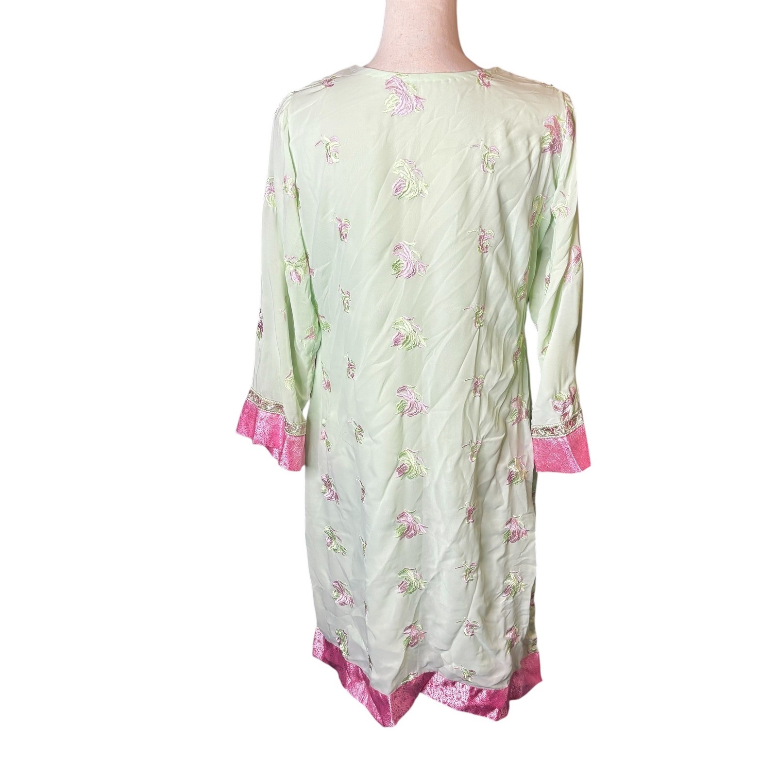 Kurta Womens Embroidered Tunic Pants Set Light Green Pink Floral 3/4 Sleeve