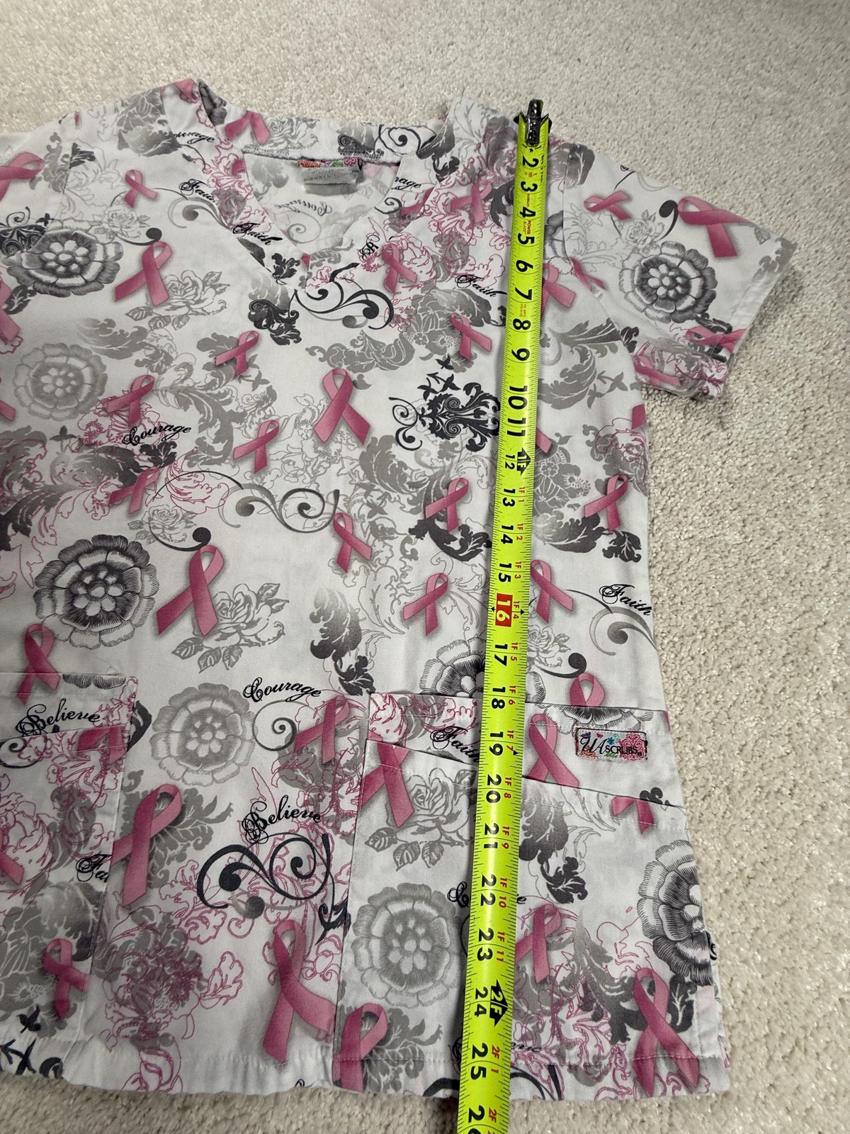 как выглядит UA Scrubs Top Womens S White Pink Ribbon Patterned V-Neck Cotton Blend фото