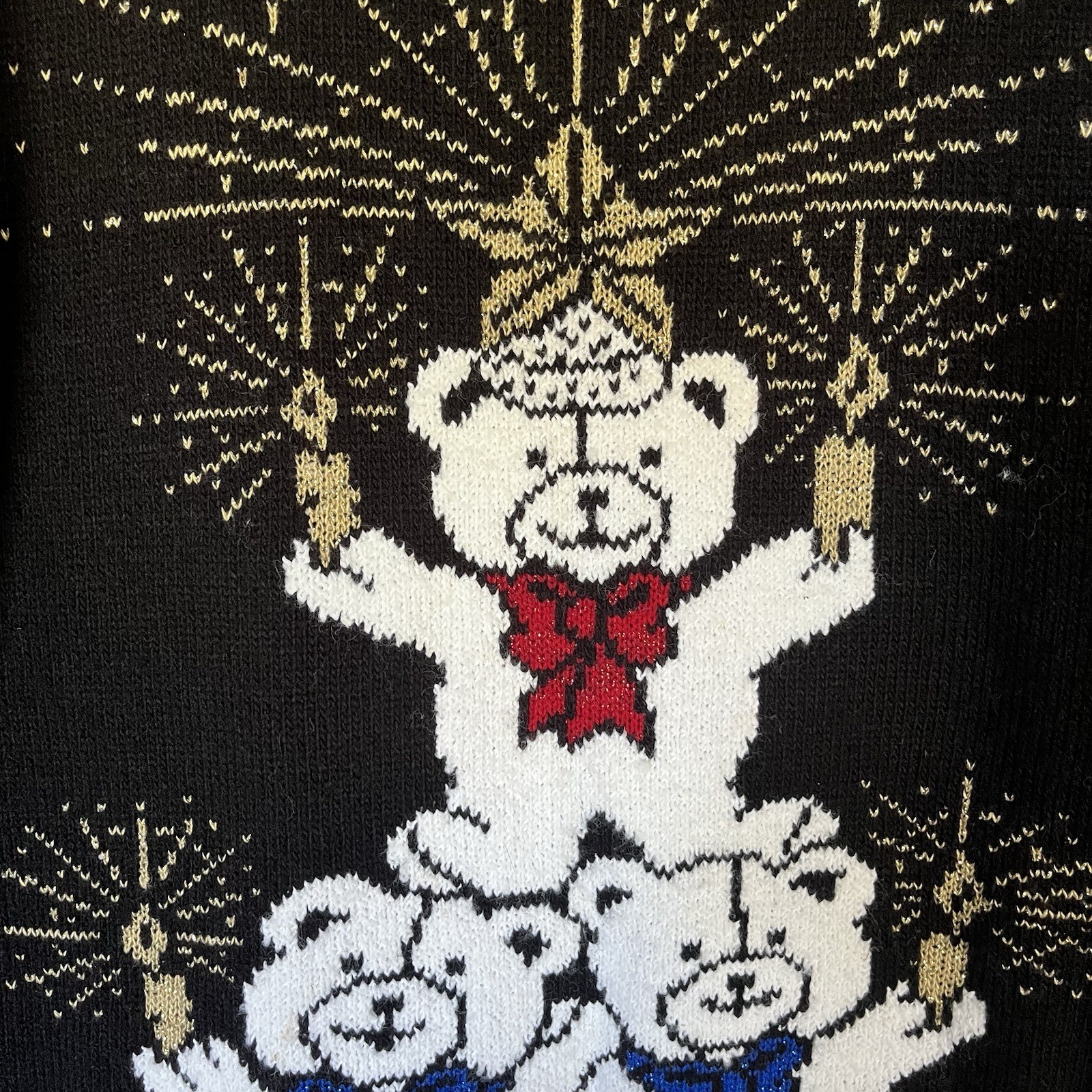 как выглядит Vtg 90s Y2K Ugly Christmas Sweater Med Black Knit Shimmer Teddy Bear Kitschy EUC фото