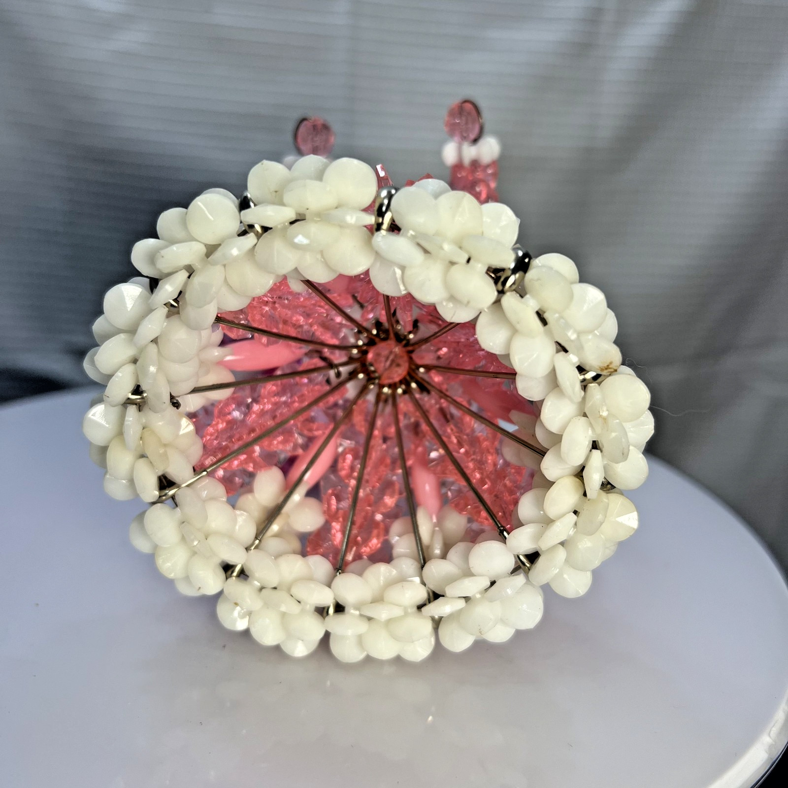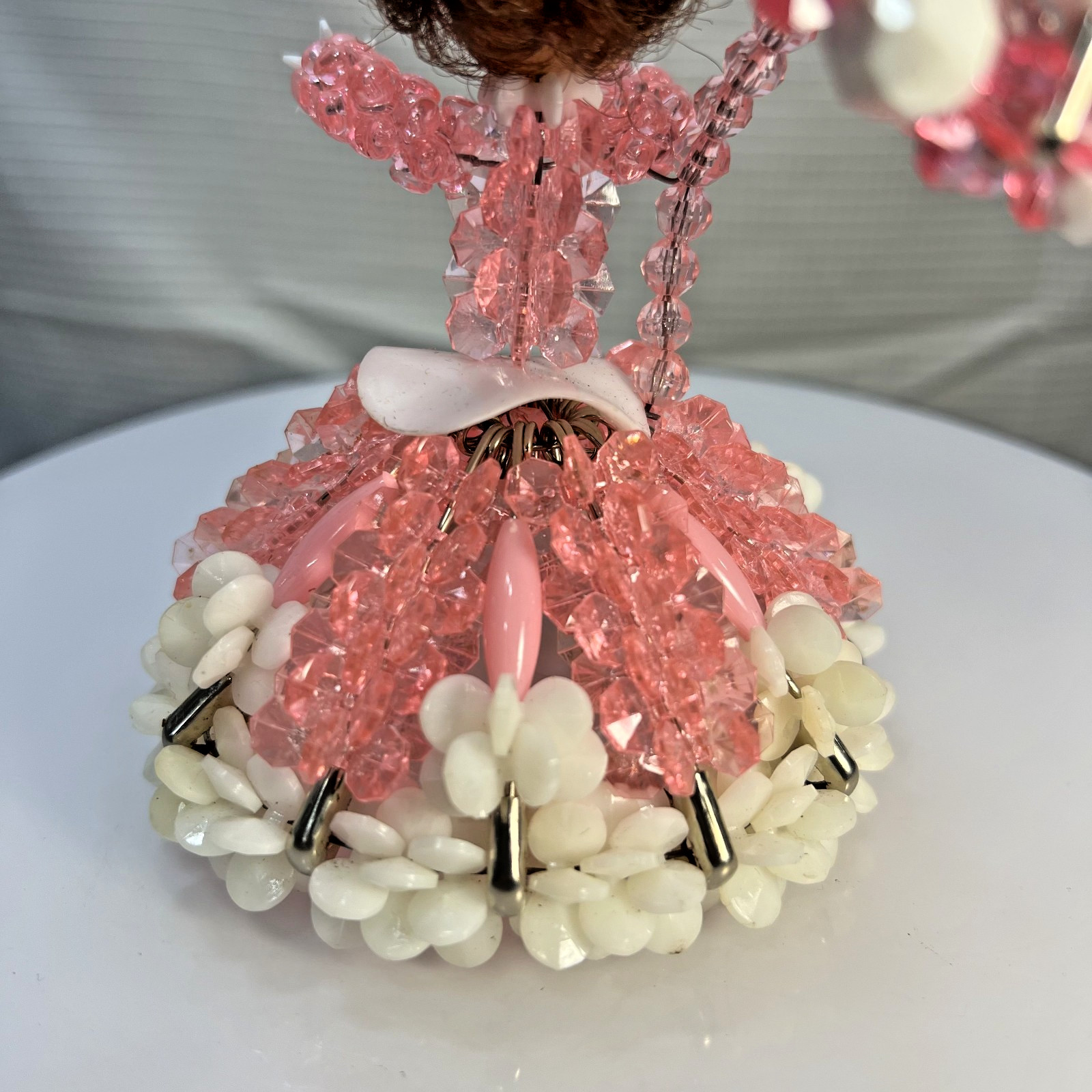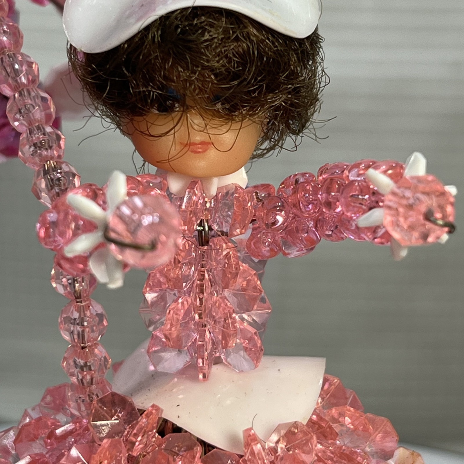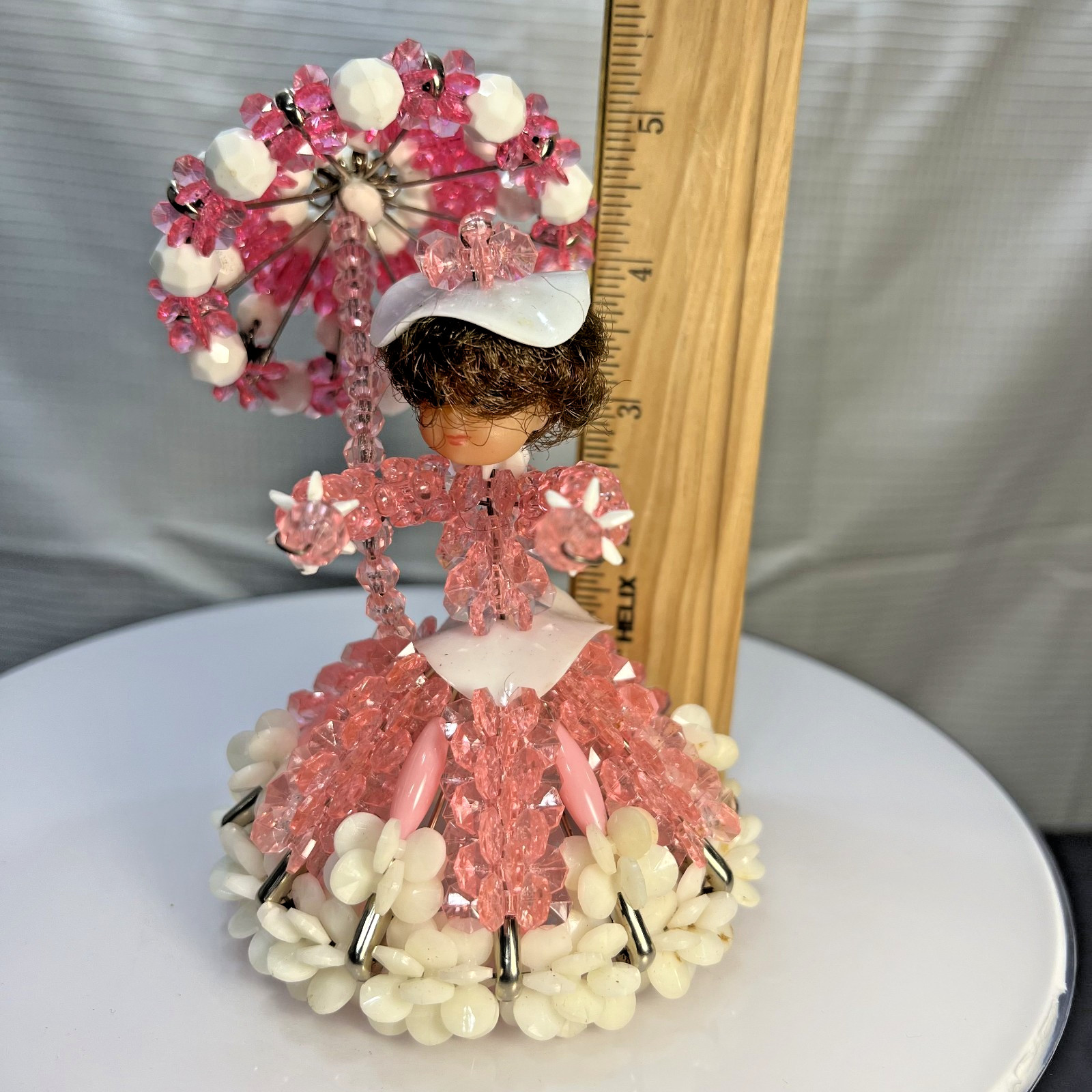 • Vintage Kitschy Beaded Safety Pin Doll w/ Parasol Bright Pink White Dark Hair