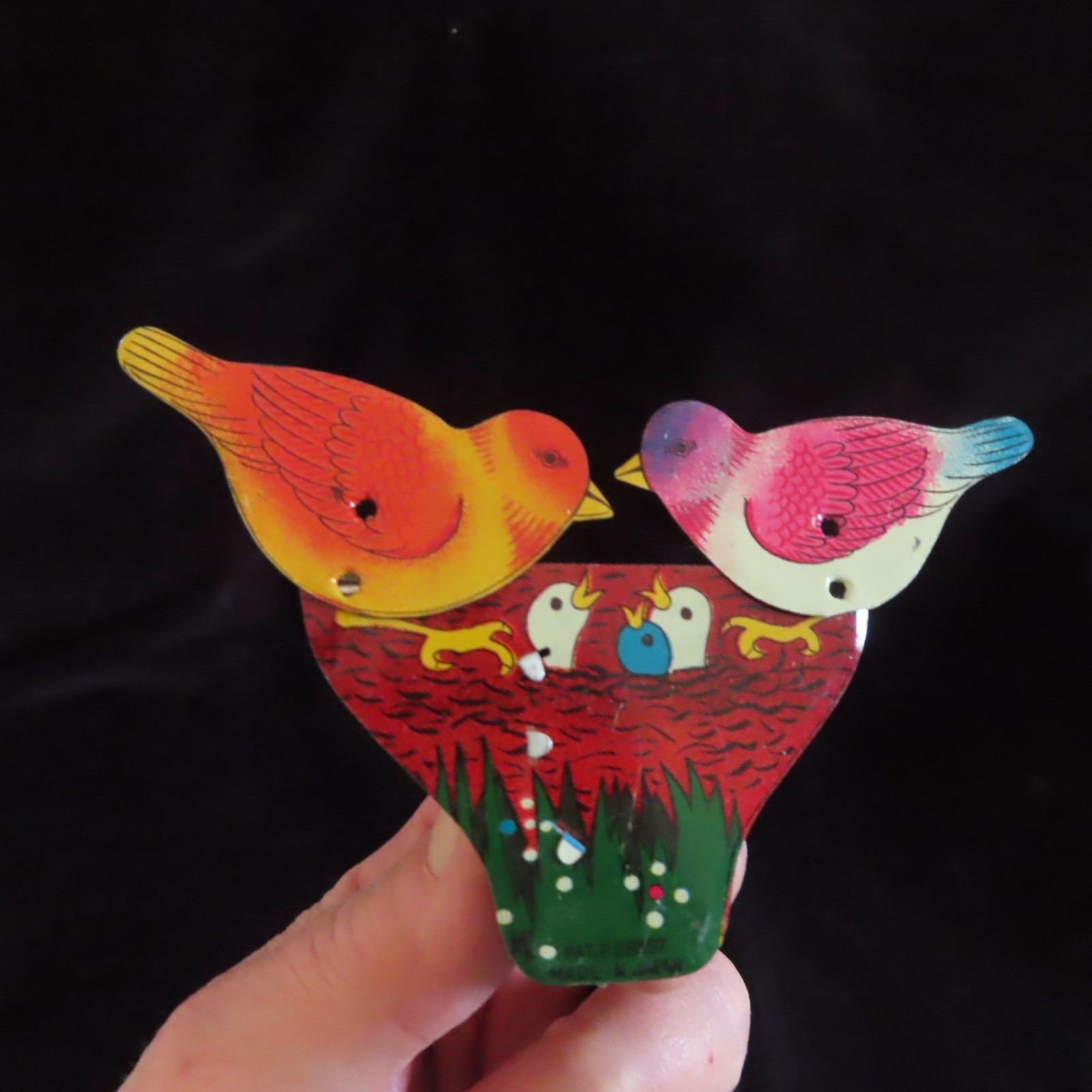Vintage set/2 Birds on Nest Tin Litho Mechanical Animated Clicker Noise Maker