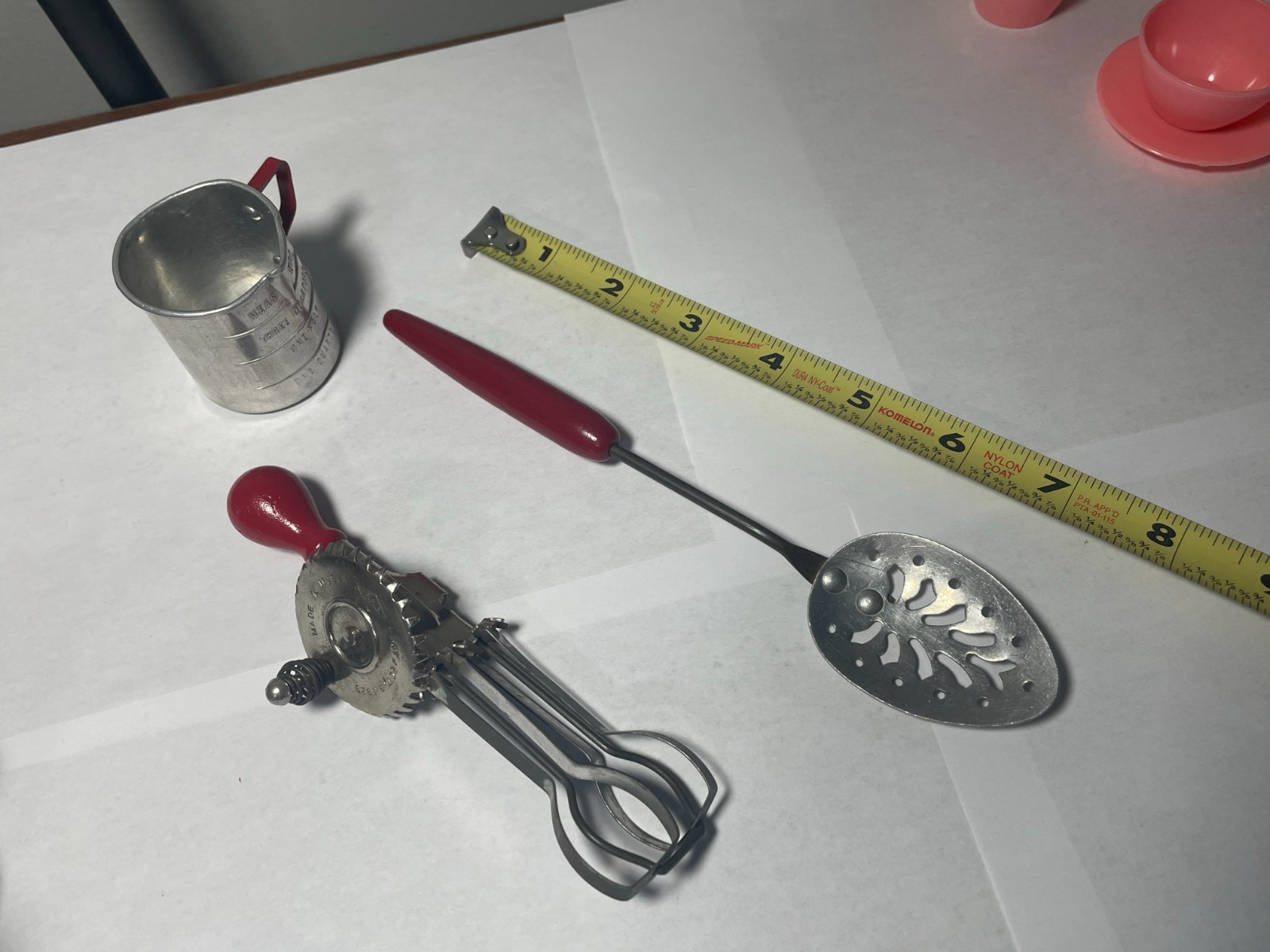 Vtg. Children s Aluminum Cookie Sheet Utensils Tins Mixer Cups 30 Piece Plastic