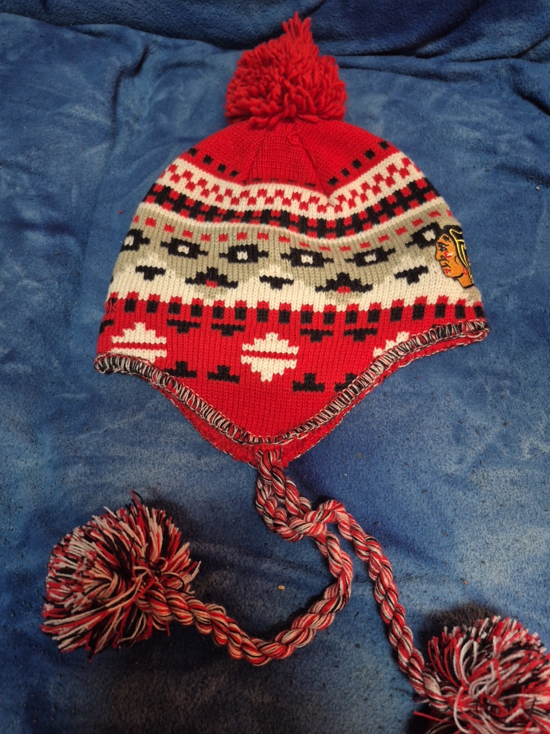 Chicago Blackhawks Beanie w/ Poms Hat Mens Black Red Knit NHL Hockey Winter