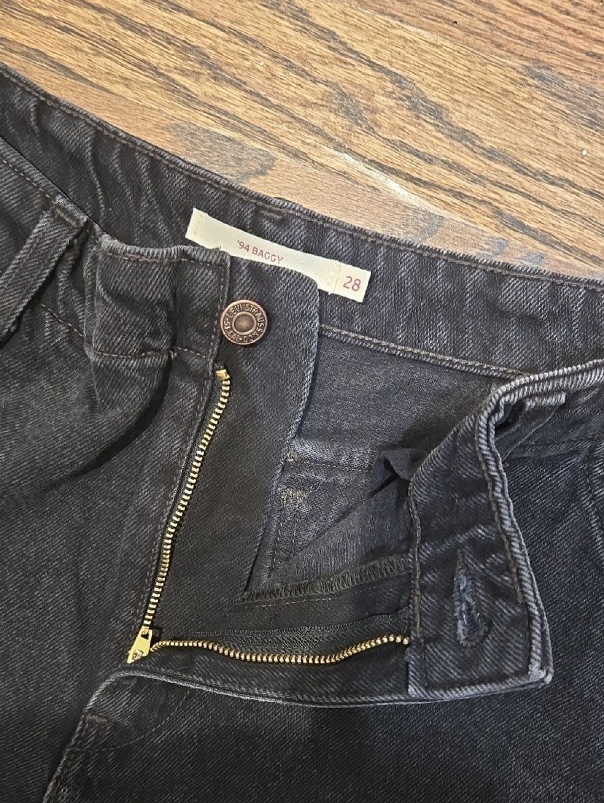 как выглядит Levi s 94 Baggy Cargo Pants Black Denim Adjustable Hem Utility 28x30 unisex фото