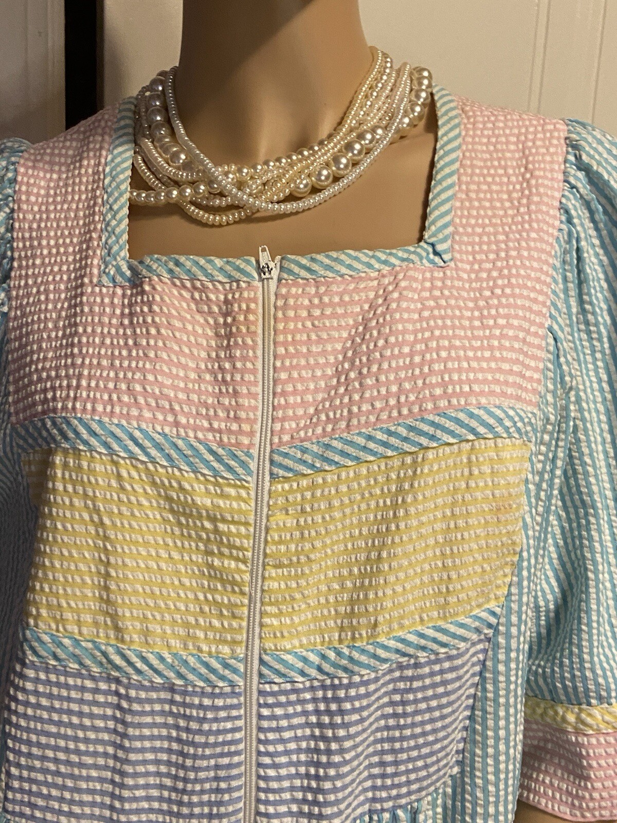 Vintage SAYBURY Seersucker Striped Maxi Muumuu House Prairie Lounge Dress M