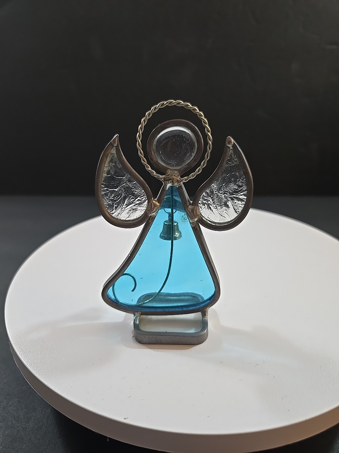• Vintage Blue Stained Glass Angel w/Bell Figurine 4 Tall Free Standing