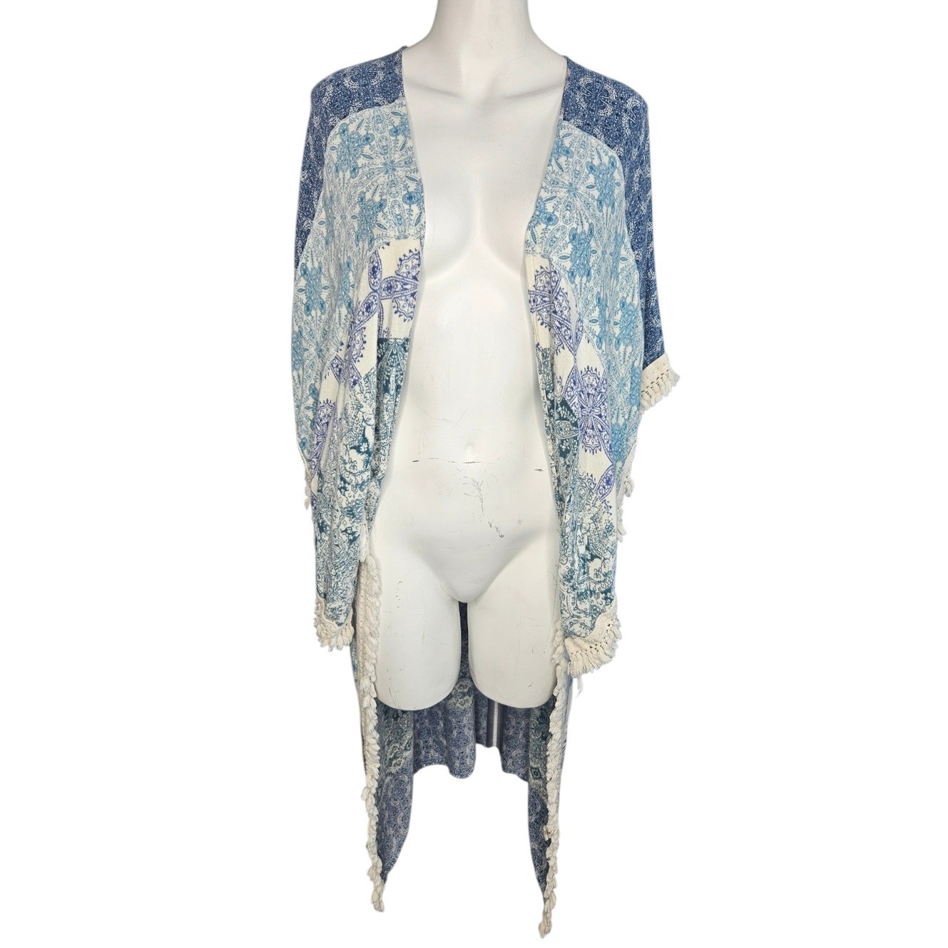 Macchia Di Ruggine Boho Patchwork Kimono Duster Blue Cream OS Hippie Indie