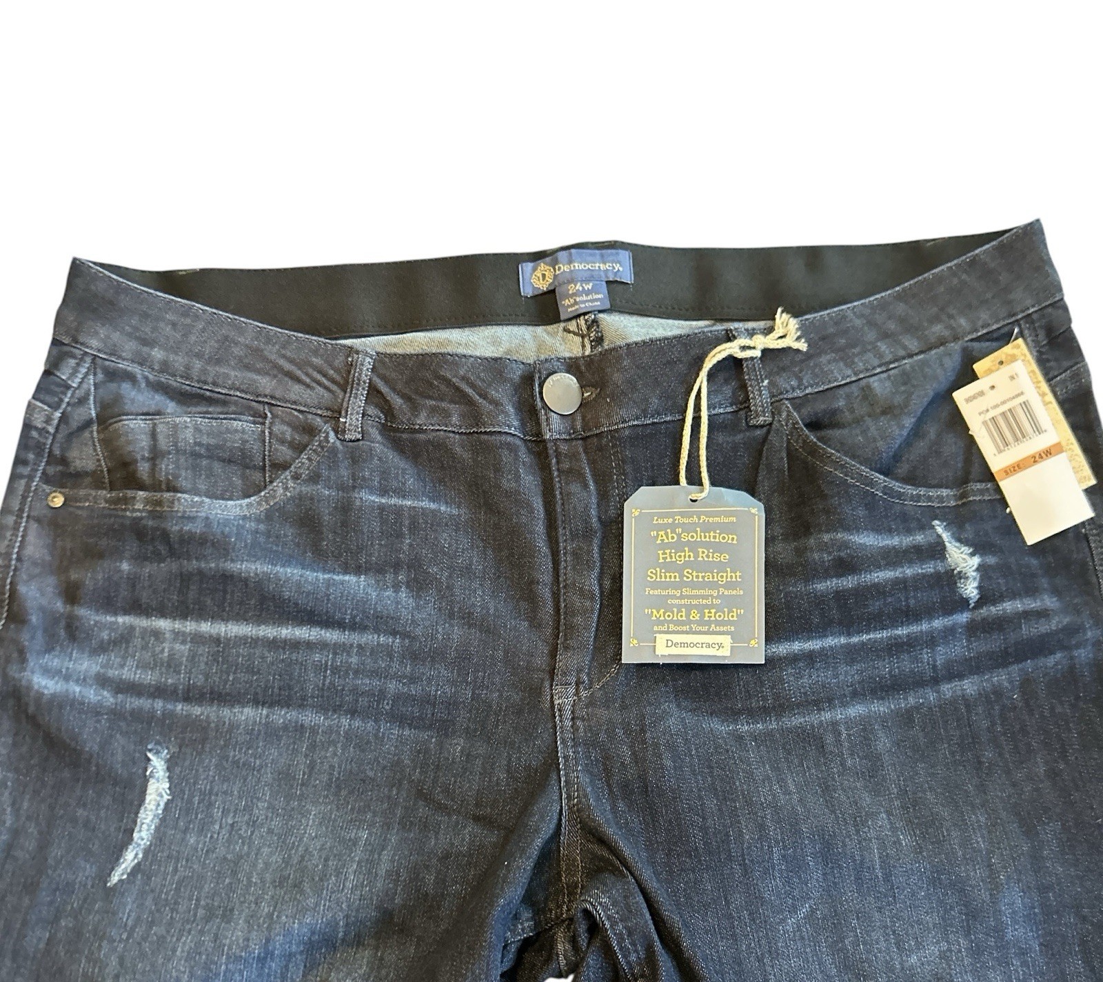 Democracy Ab Solution Straight Slim Jeans 24W Blue Distressed Raw Hem Cropped.