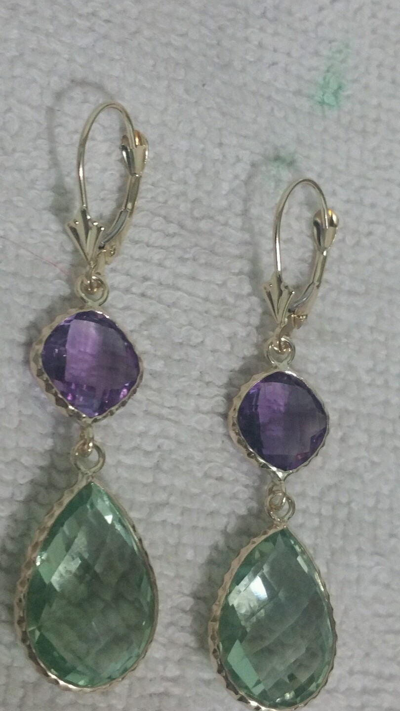 как выглядит 14k Yellow Gold Earrings With Green Amethyst And Amethyst Stones фото