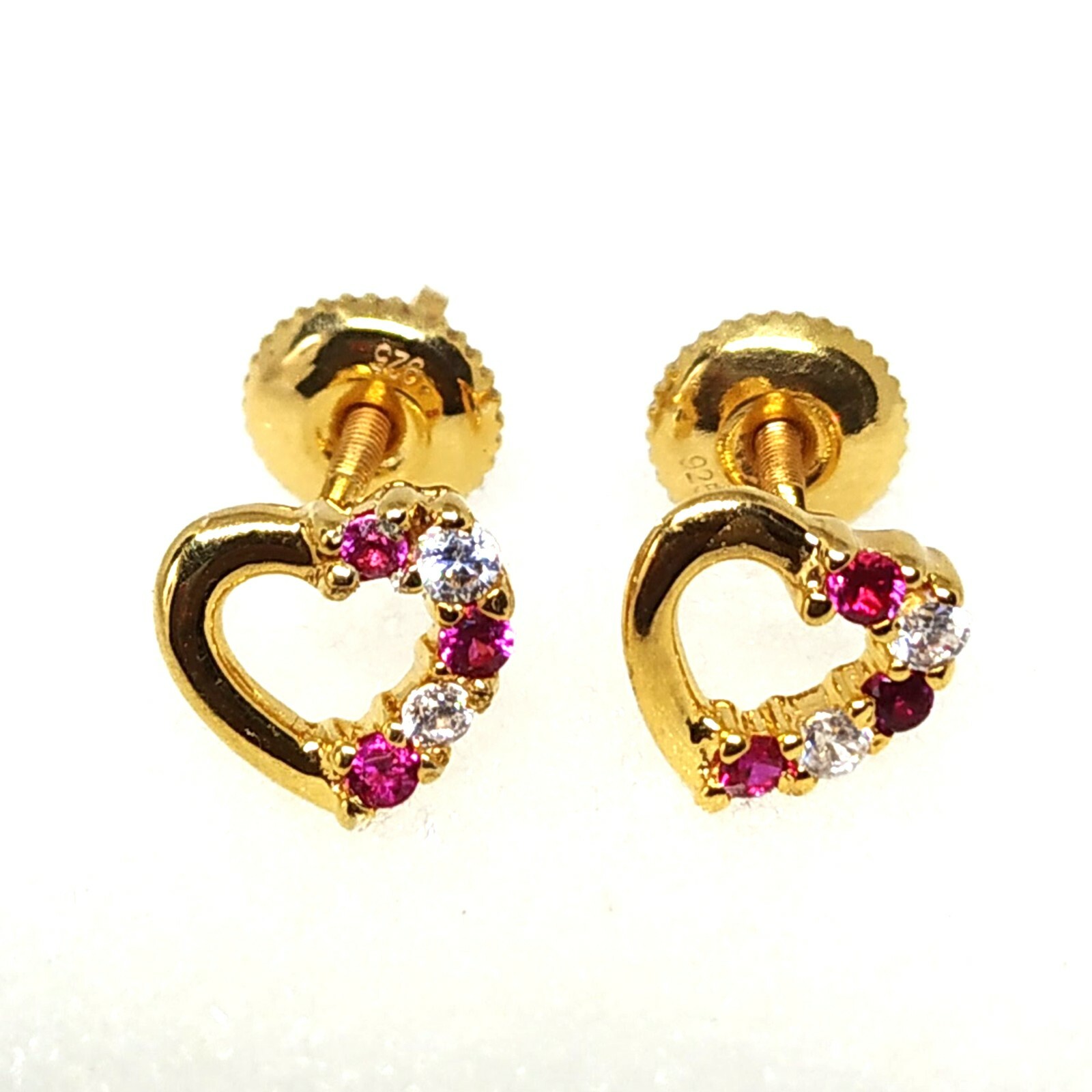 14k Yellow Gold Plated Pink CZ Open Heart Children Screw Back Baby Girl Earrings
