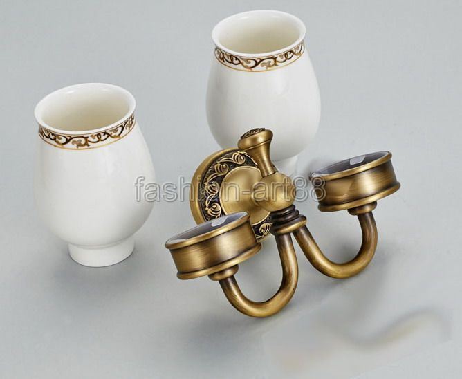 Antique Brass Wall Mounted Bathroom Toothbrush Holder Set Ceramic Cups fba495