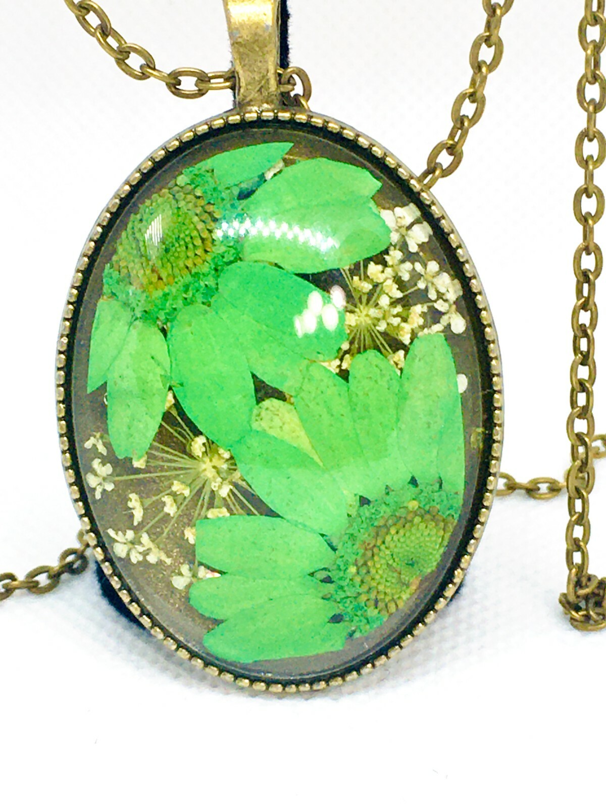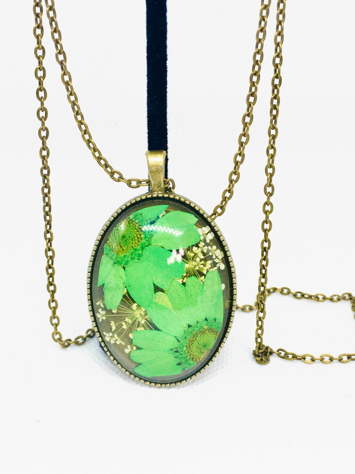 Handmade Boho Floral Chain Necklace, Natural Real Dried Flower Pendant, Green