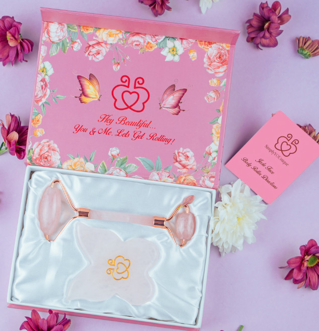 Natural 3 in 1 Rose Quartz Roller Crystal Gua Sha Facial Spa Set Free Ship