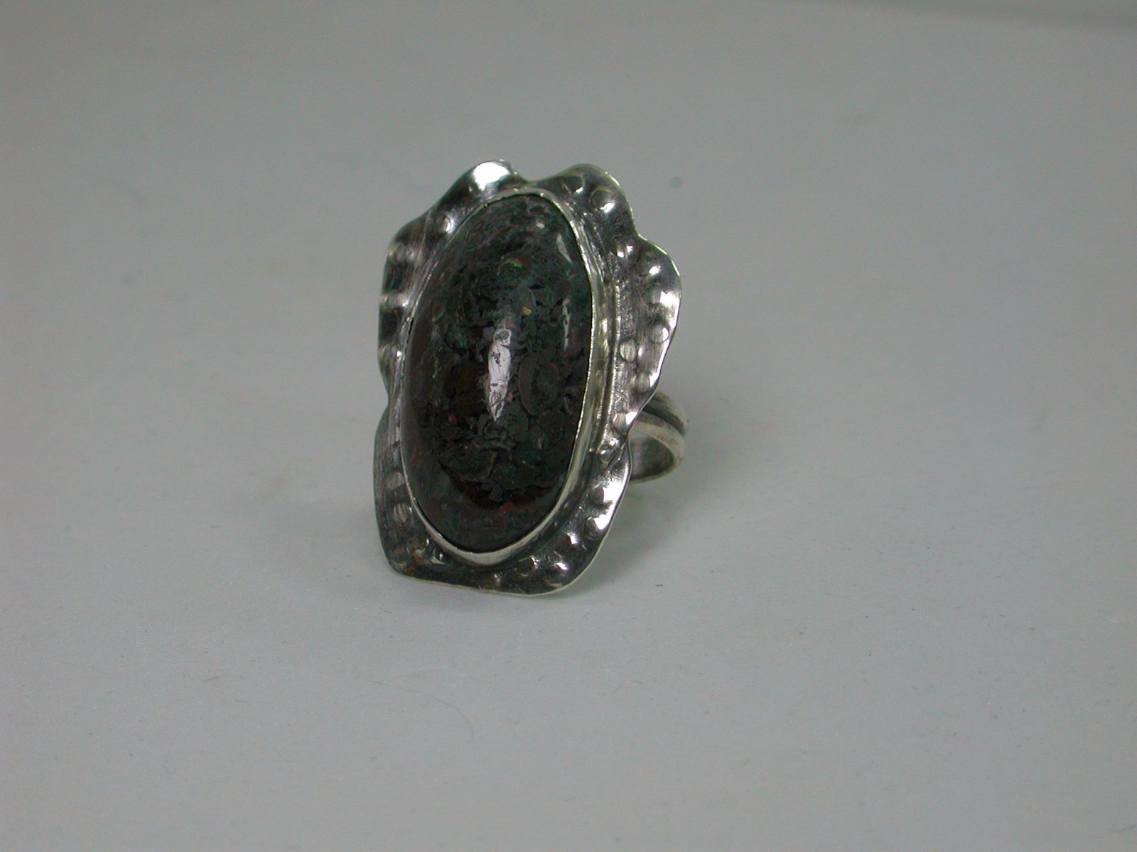 Sterling Silver Ring with Moss Agate Cabochon Artisan Handmade Metalwork Jewelry