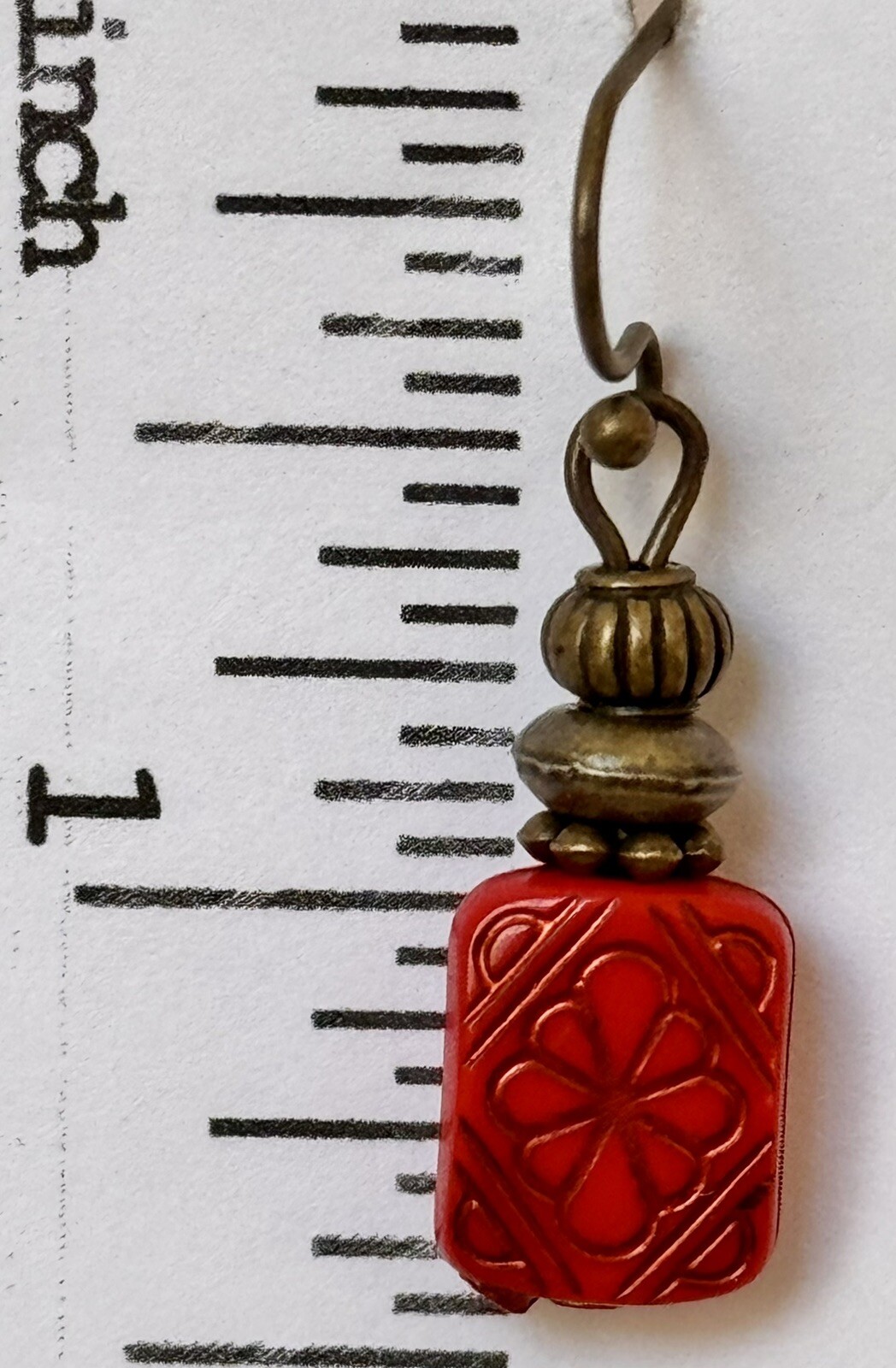Bronze Tone with Etched Red Vintage Bead Dangle Earrings. Light Weight