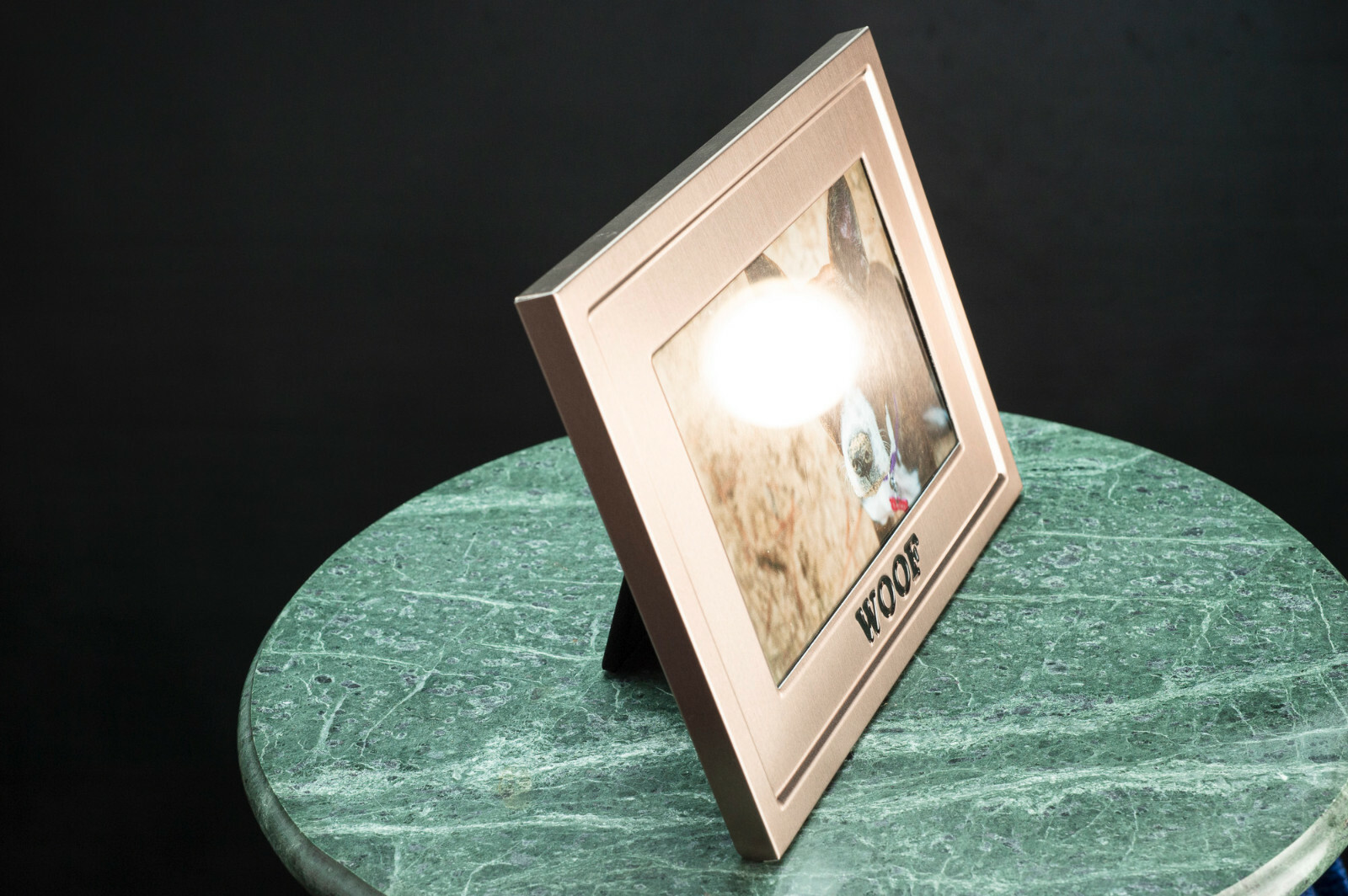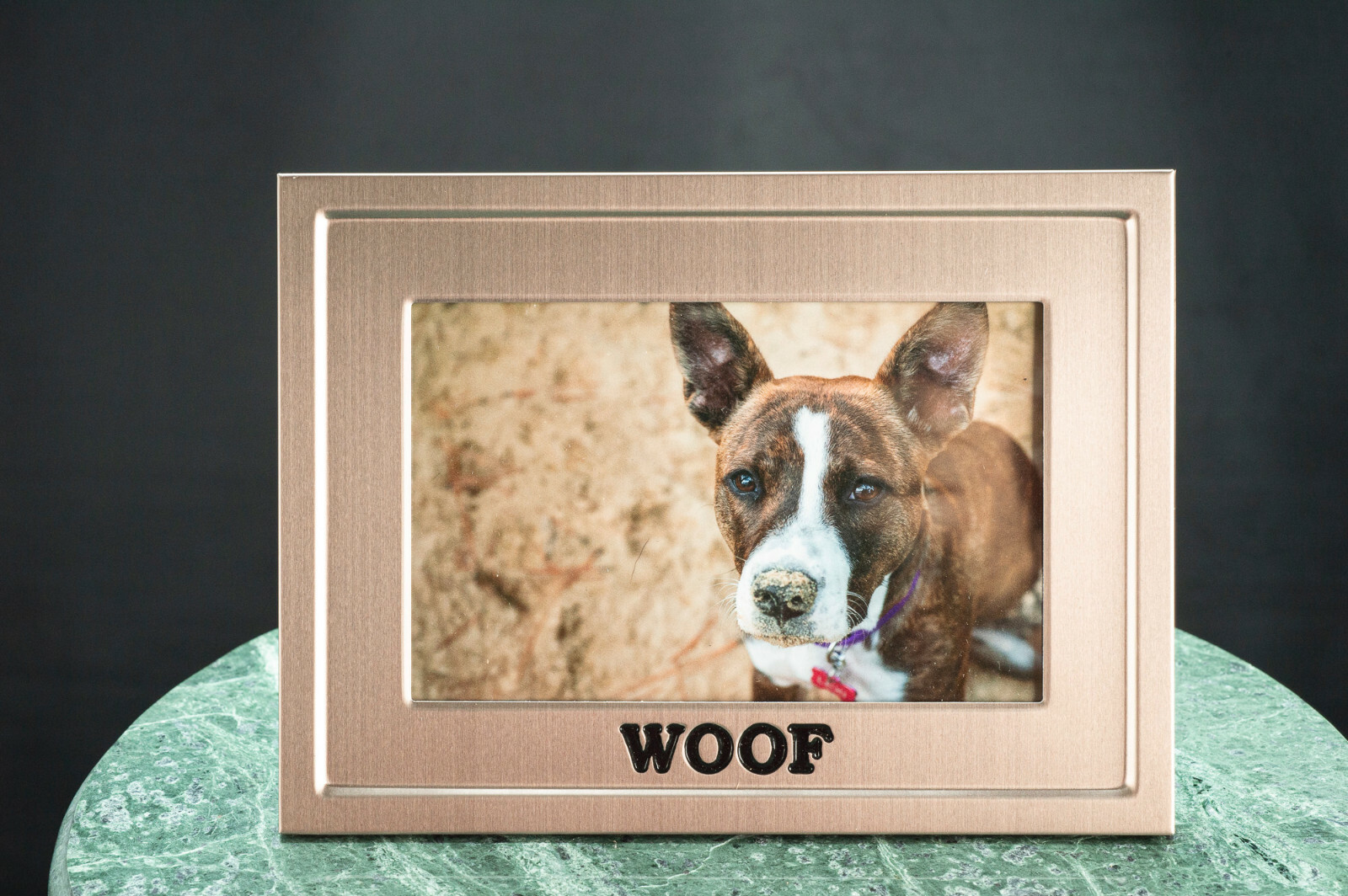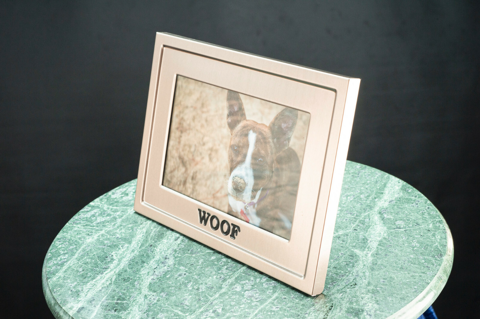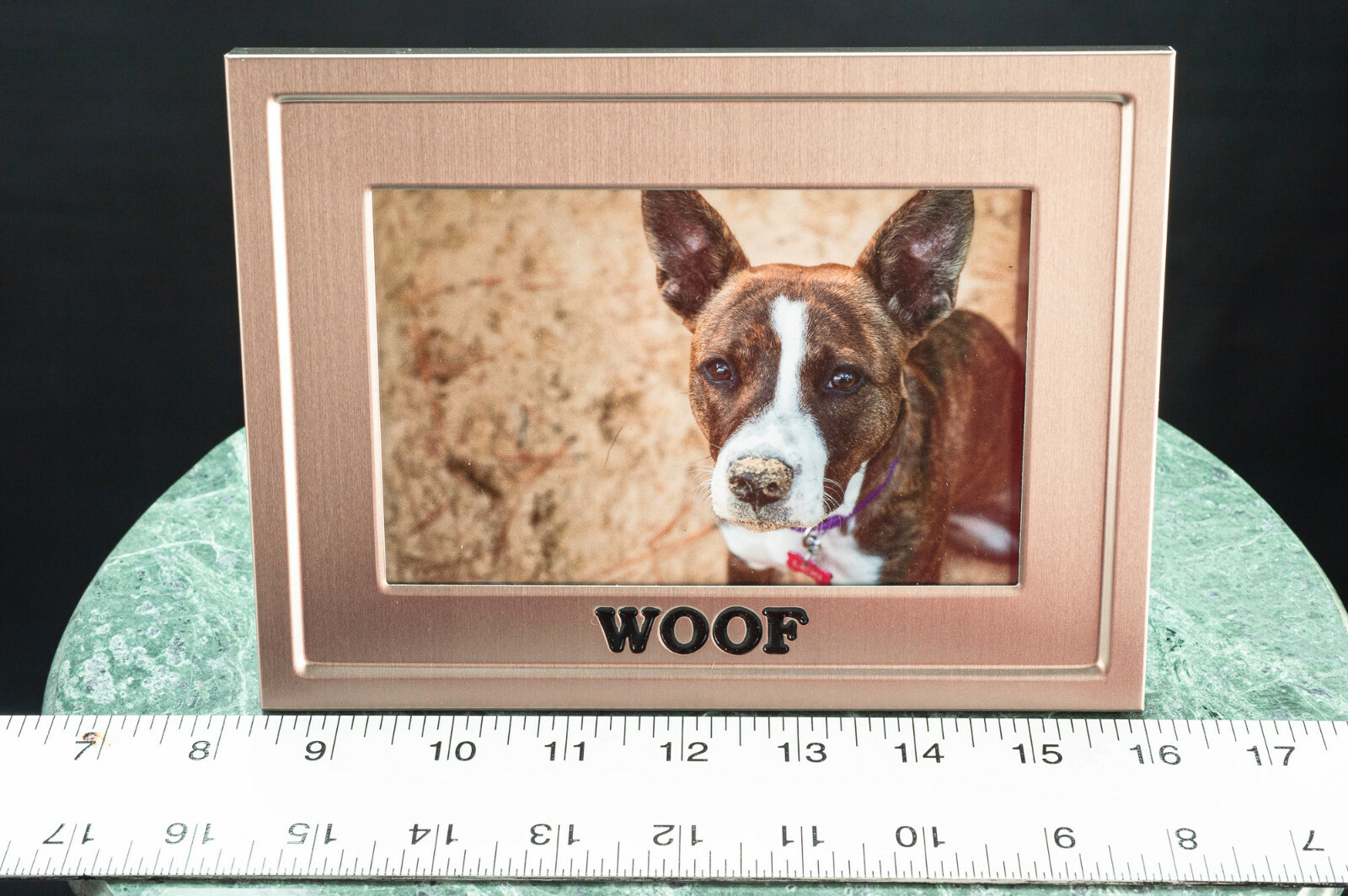 Brushed silver metal dog picture frame Woof w/easel for 4x6 photo