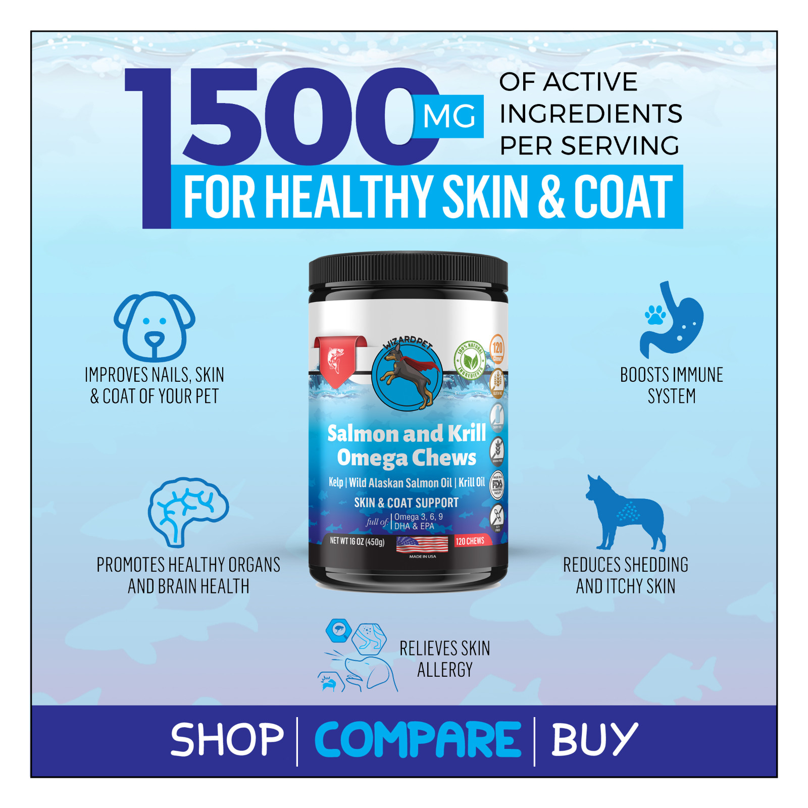 WIZARDPET Krill Salmon Oil Dog Soft Chews Omega 120 ct 3 6 9 EPA DHA