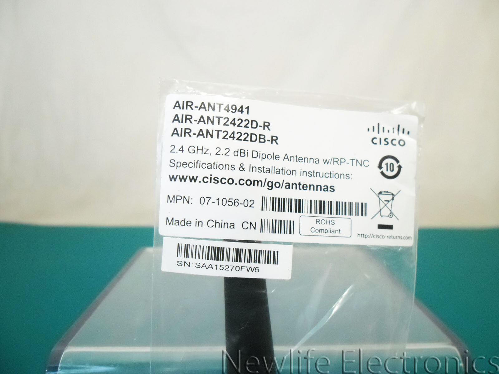 New Cisco 2.4 GHz, 2.2 dBi Dipole Antenna w/RP-TNC 07-1056-02