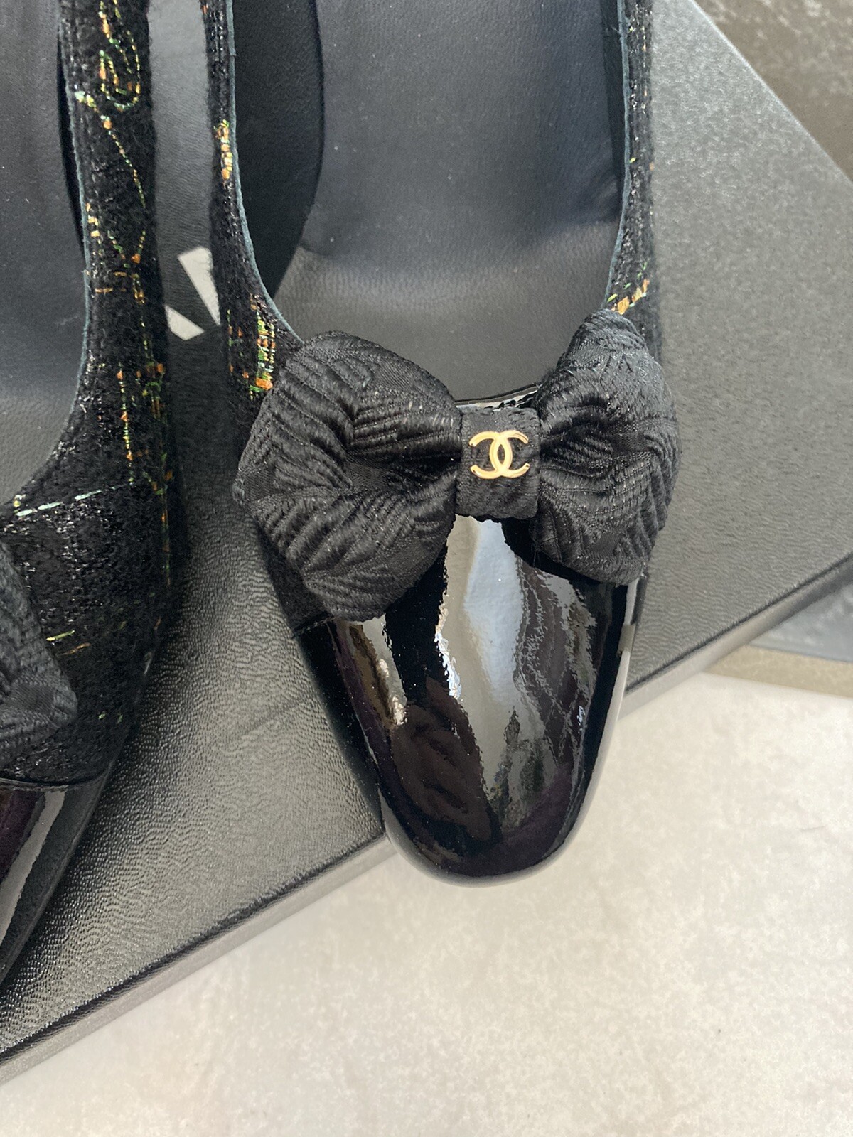 как выглядит NIB 100 AUTH Chanel G31387 15K Black Patent Cap Toe Tweed Bow Heels Pumps 925 фото