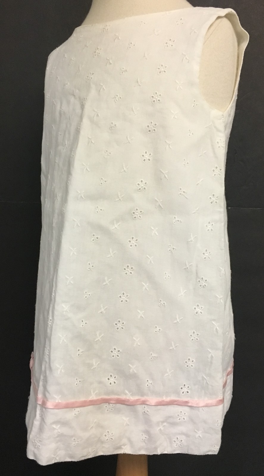 Vintage Girls Toddler Textured Embroidered Design Dress w/ Pink Ribbon Bottom