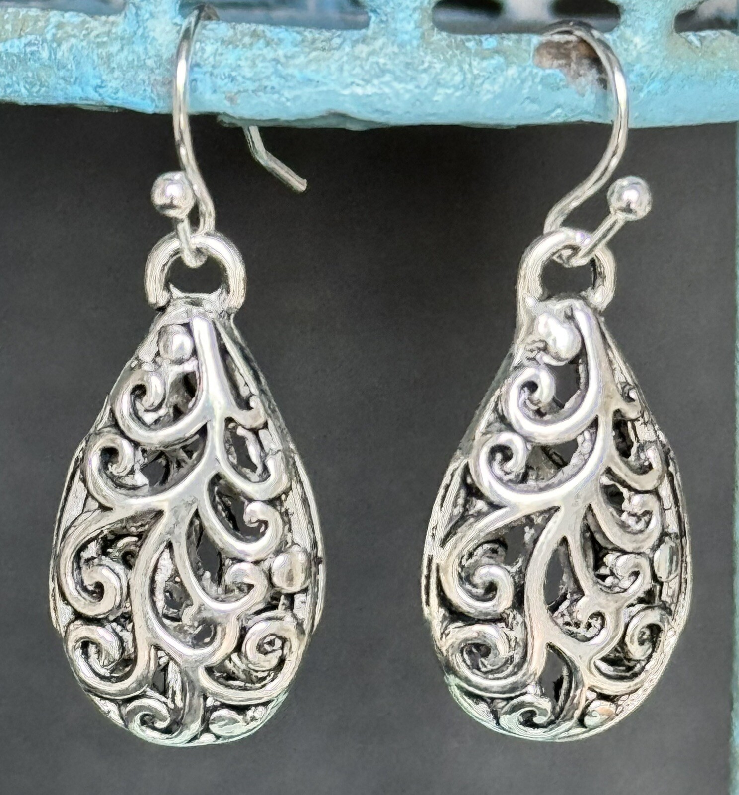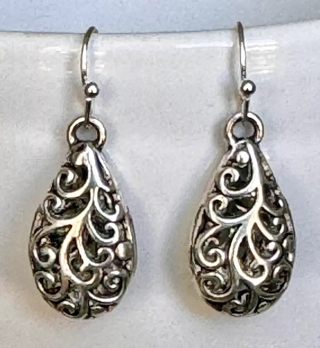 Beautiful Etched Silver Tear Drop Dangle Earrings.
