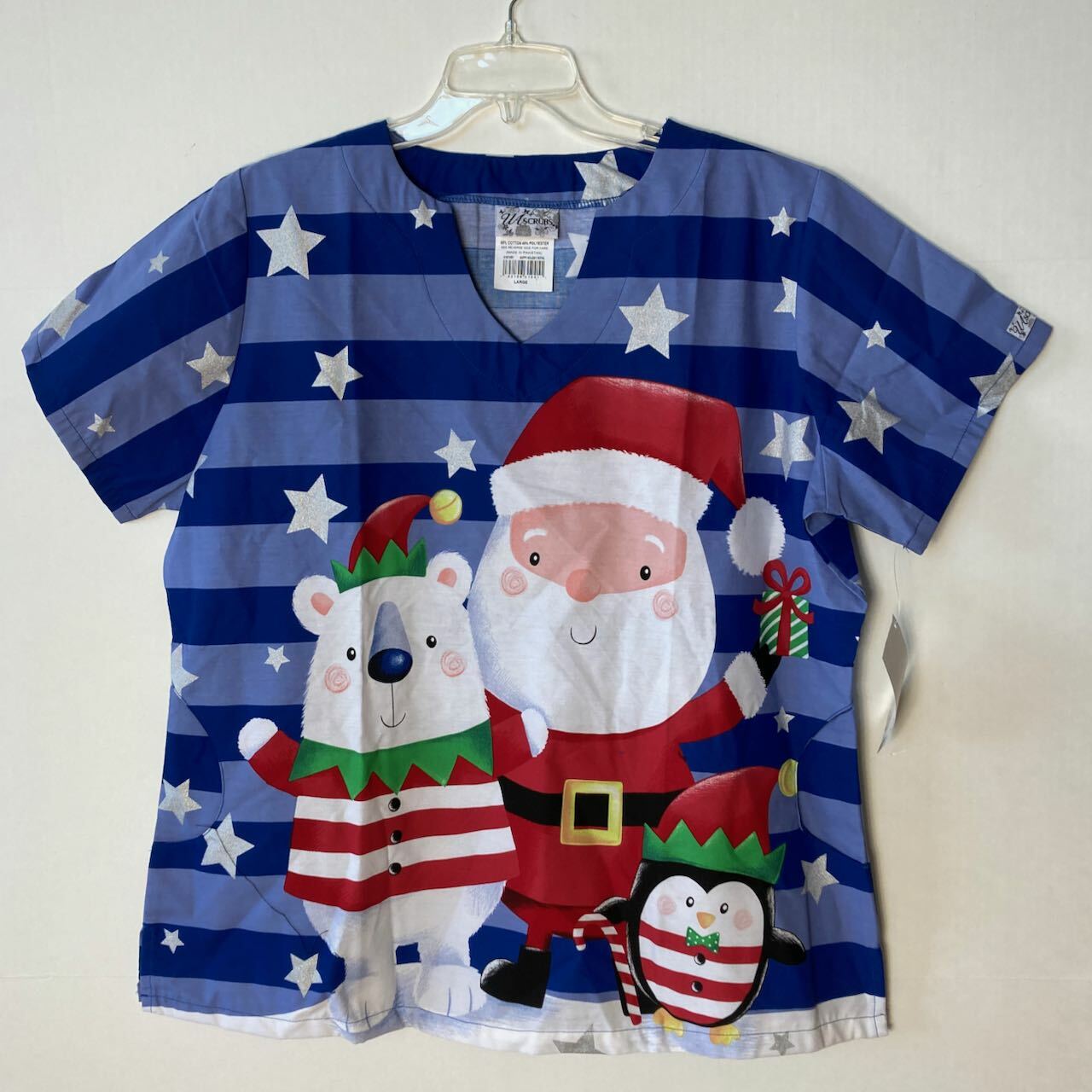 NWT UA Scrubs Santa Bear Penguin Christmas Scrub Top Blue Striped Sz L Holiday