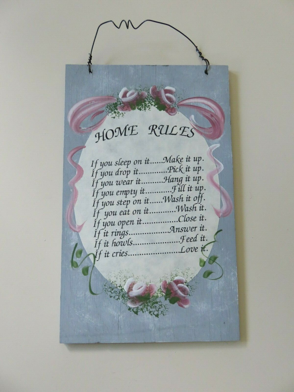 Hand-painted Home Rules Plaque Country Blue Dusty Rose