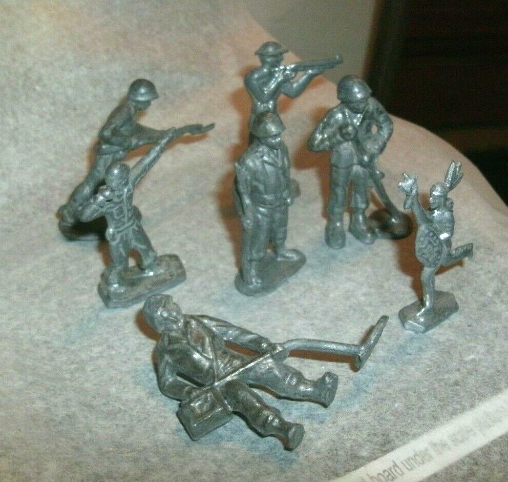 7 VINTAGE LEAD FIGURES, 6 SOLDIERS, 1 AMERICAN INDIAN WITH TOMAHAWK