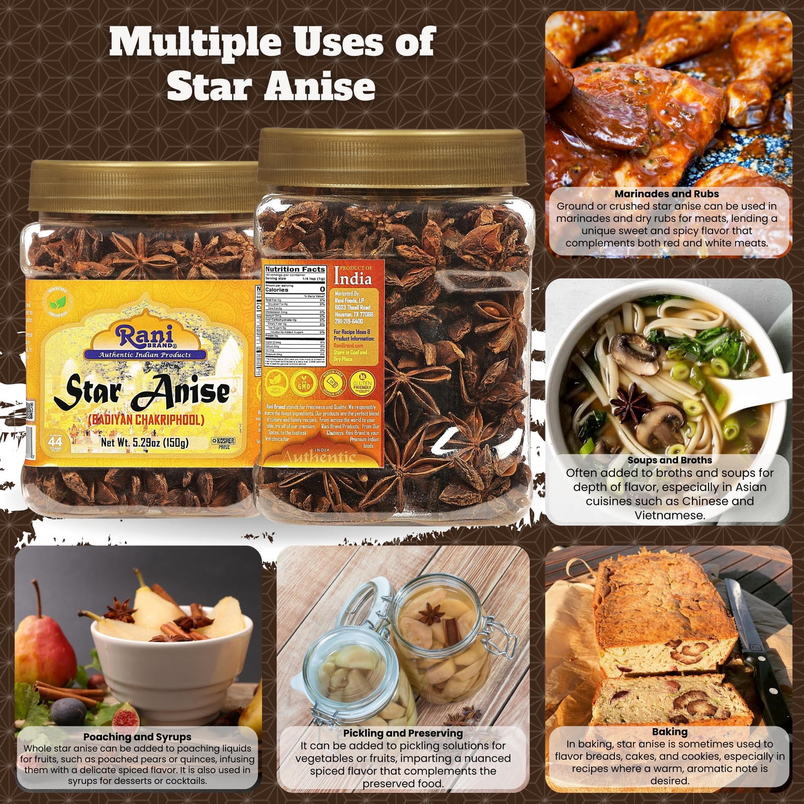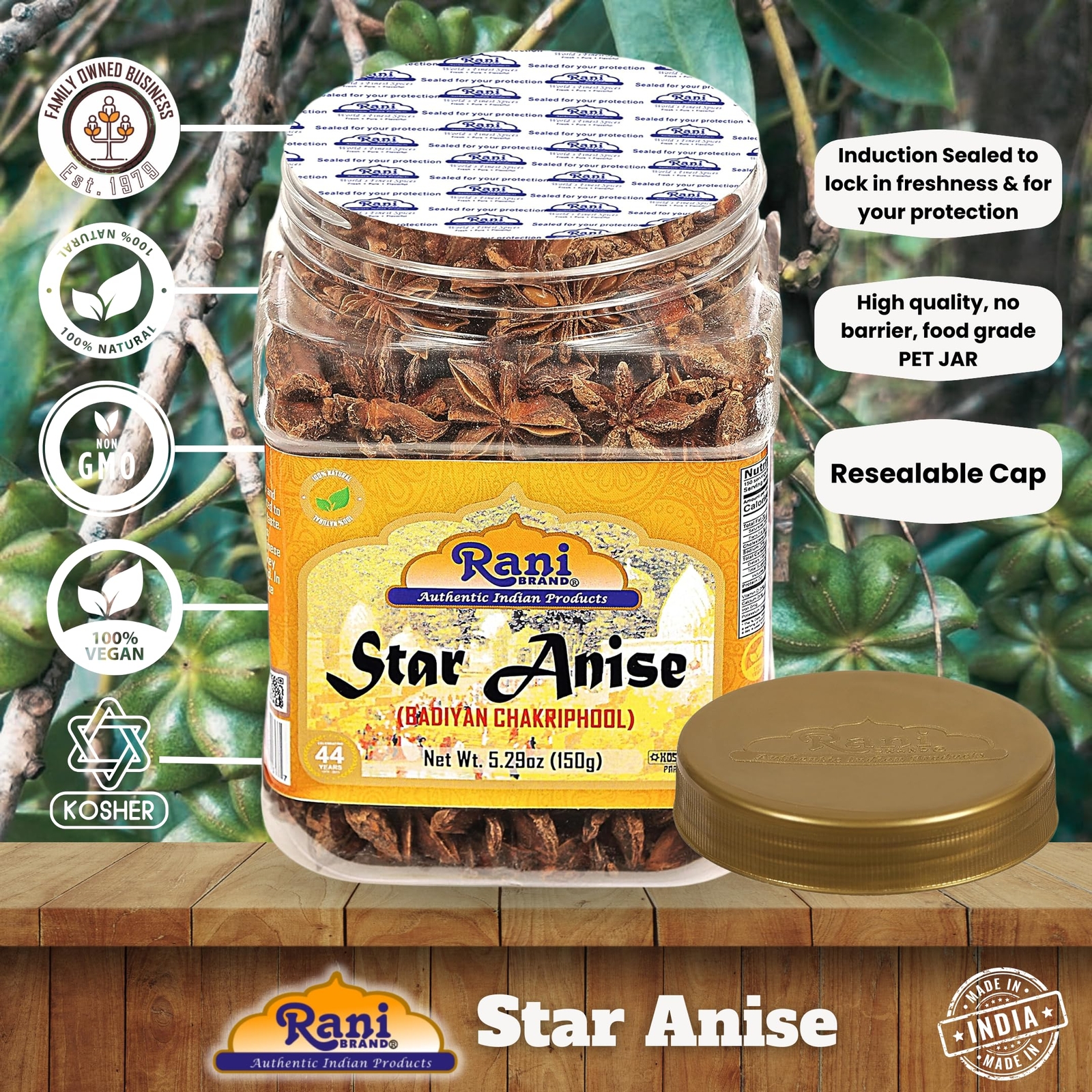 Rani Star Anise Seeds, Whole Pods Badian Khatai Spice 5.29oz 150g PET Jar