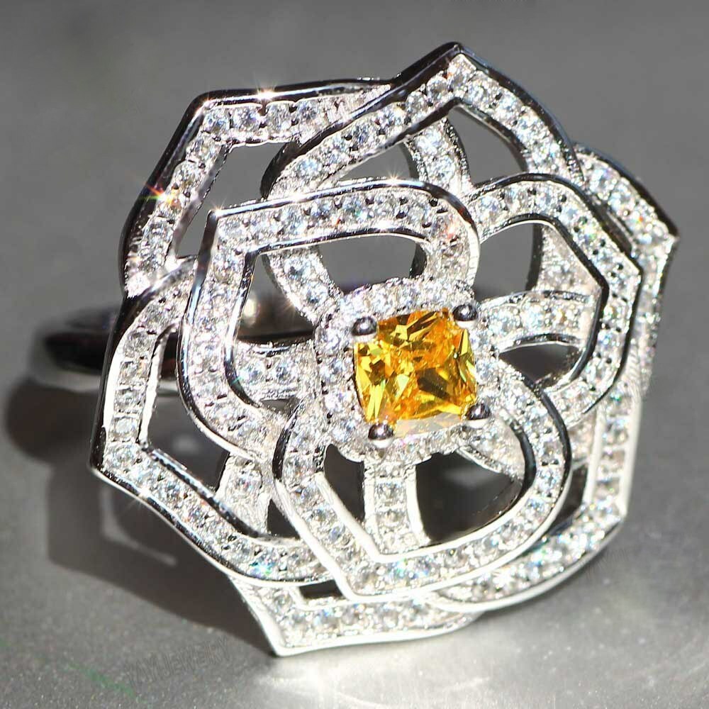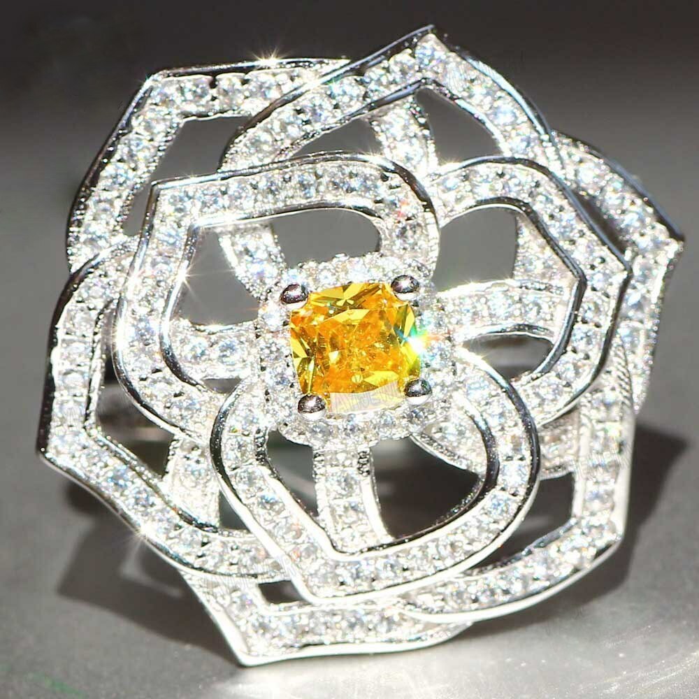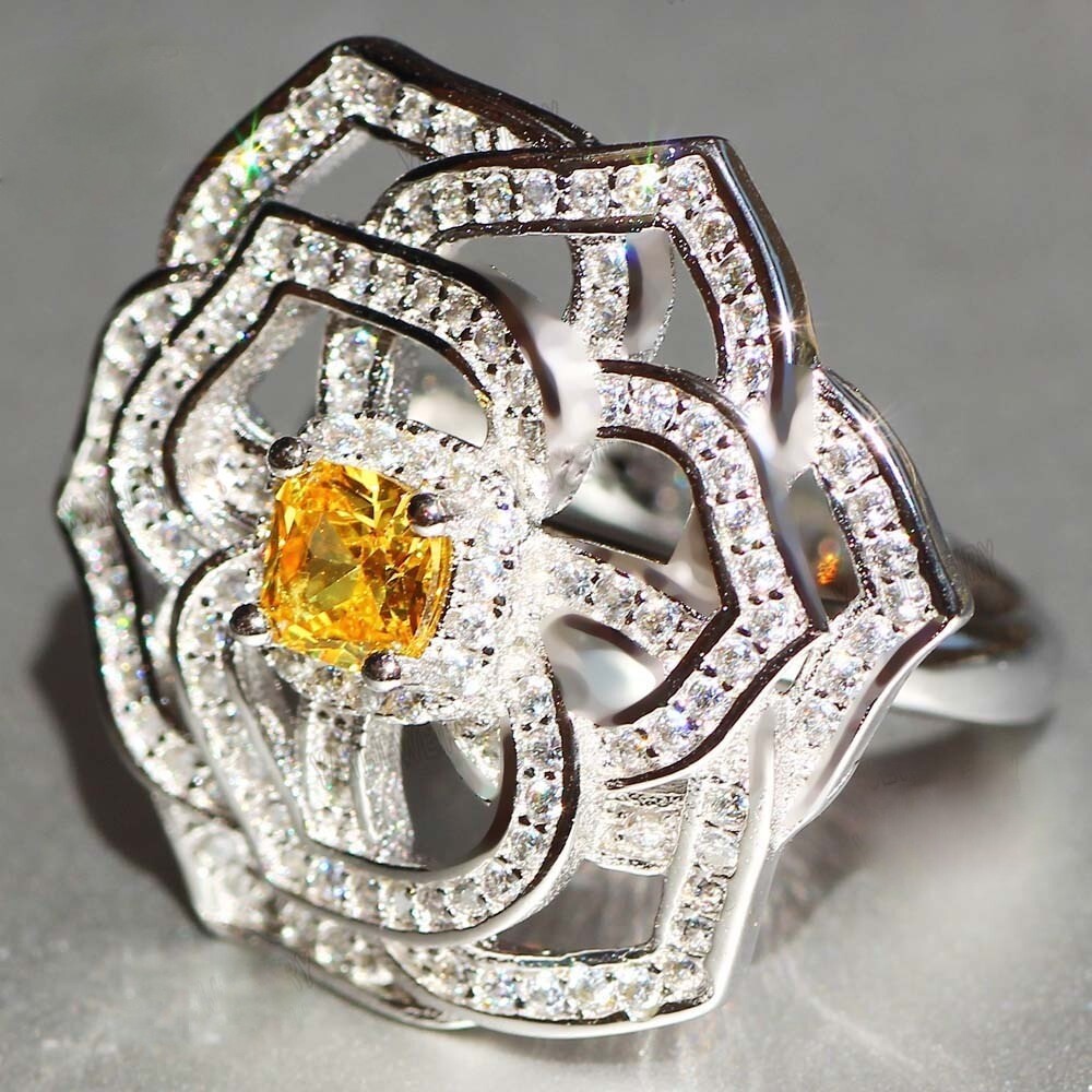 Center Yellow Cushion Shape Citrine With Beautiful CZ Halo Flower Wedding Ring