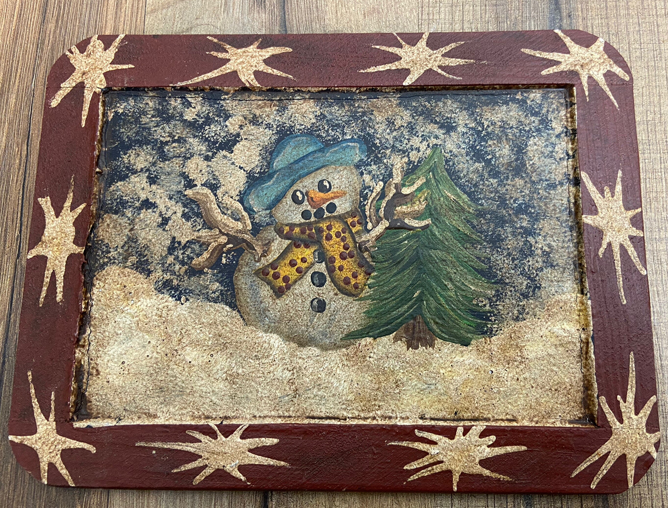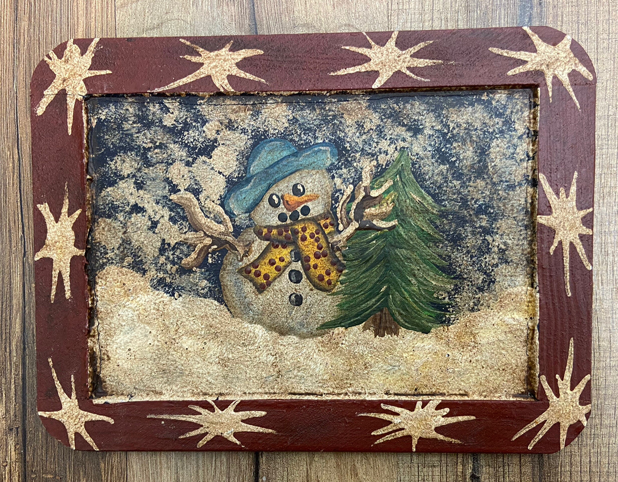 Slates by Zeg Hand Painted Snowman and Tree Wooden Frame Handmade Art Winter