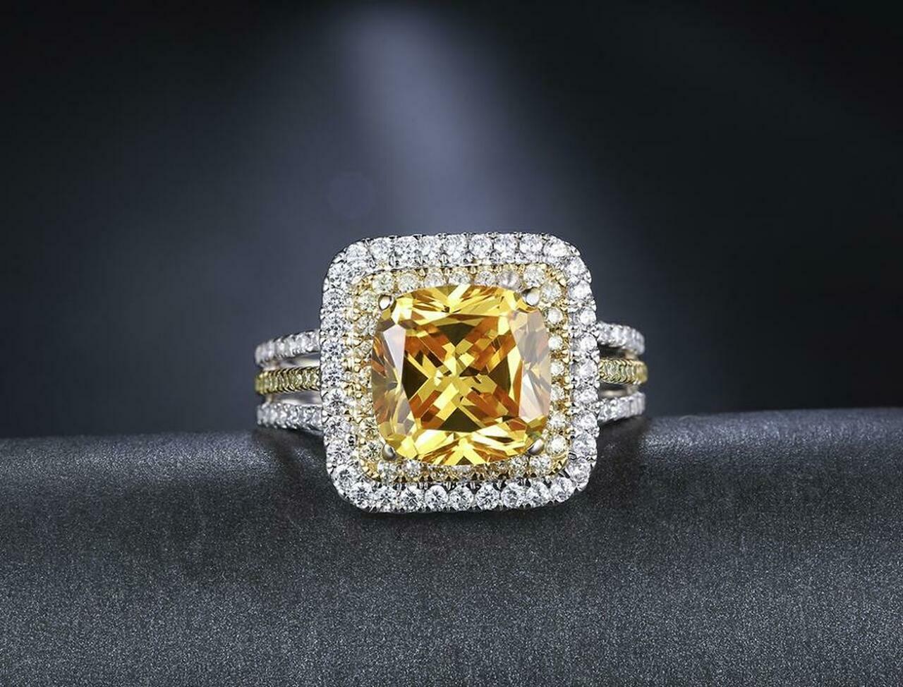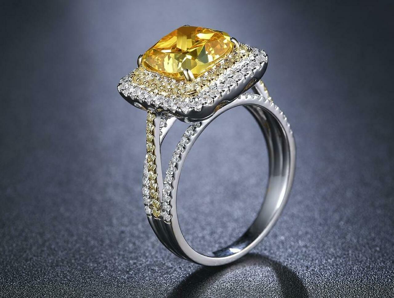 как выглядит Honey Yellow Cushion Round Cut 3.02CT Citrine With White CZ Double Halo Ring фото